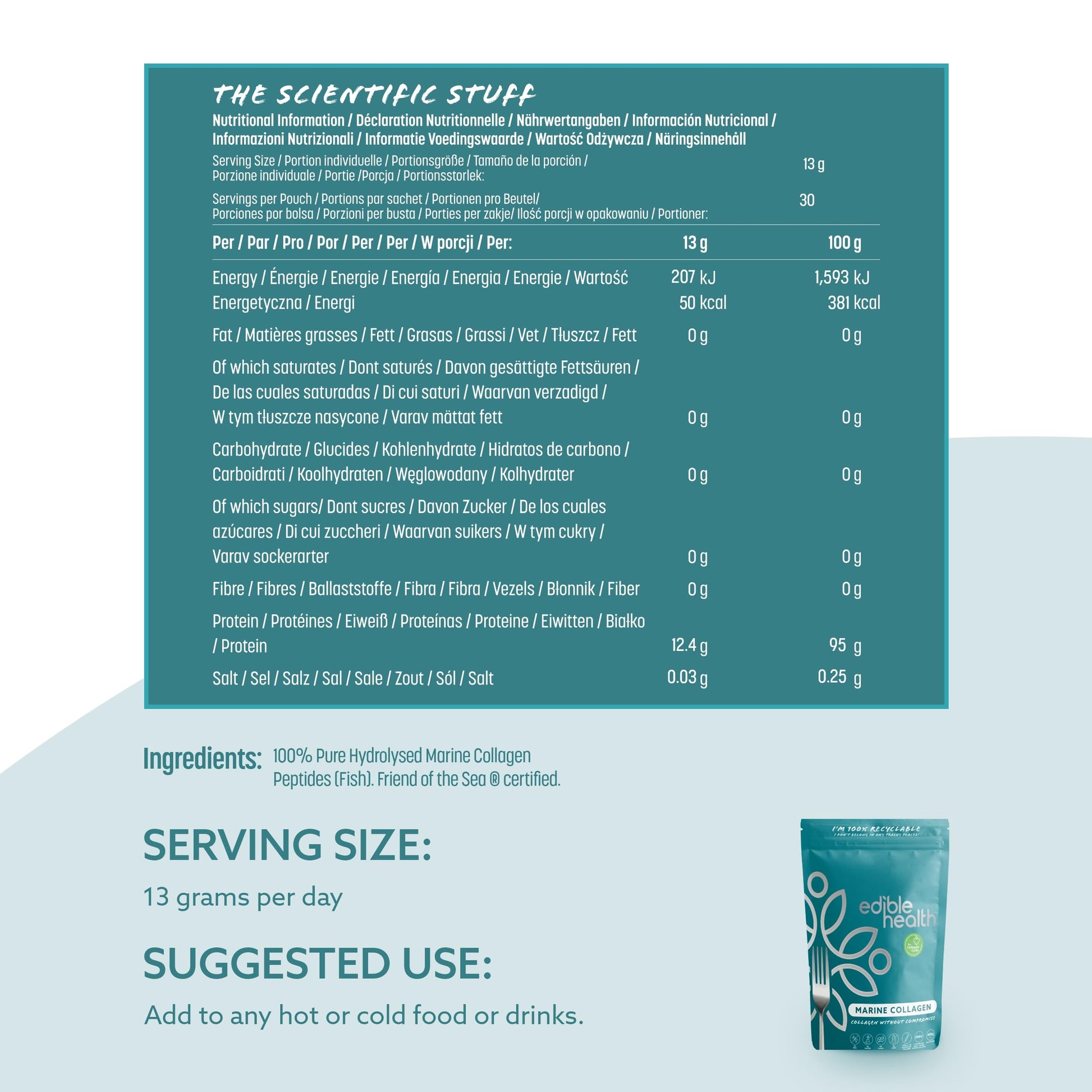 Edible Health's Premium Marine Collagen powder is a great way to add protein to your diet. Our fast-dissolving collagen powder is bovine derived and contains 8 out of the 9 essential amino acids our bodies need, with 18 amino acids in total. There are no fillers, soy or chemicals in this naturally non-GMO food supplement. No dairy or sugar either. Our Collagen Powder also comes in a variety of different sizes to best suit your lifestyle. PEOPLE BEFORE PROFITS — Edible Health is a UK business established in 2016 which prides itself on empowering people on their health journey.More Info