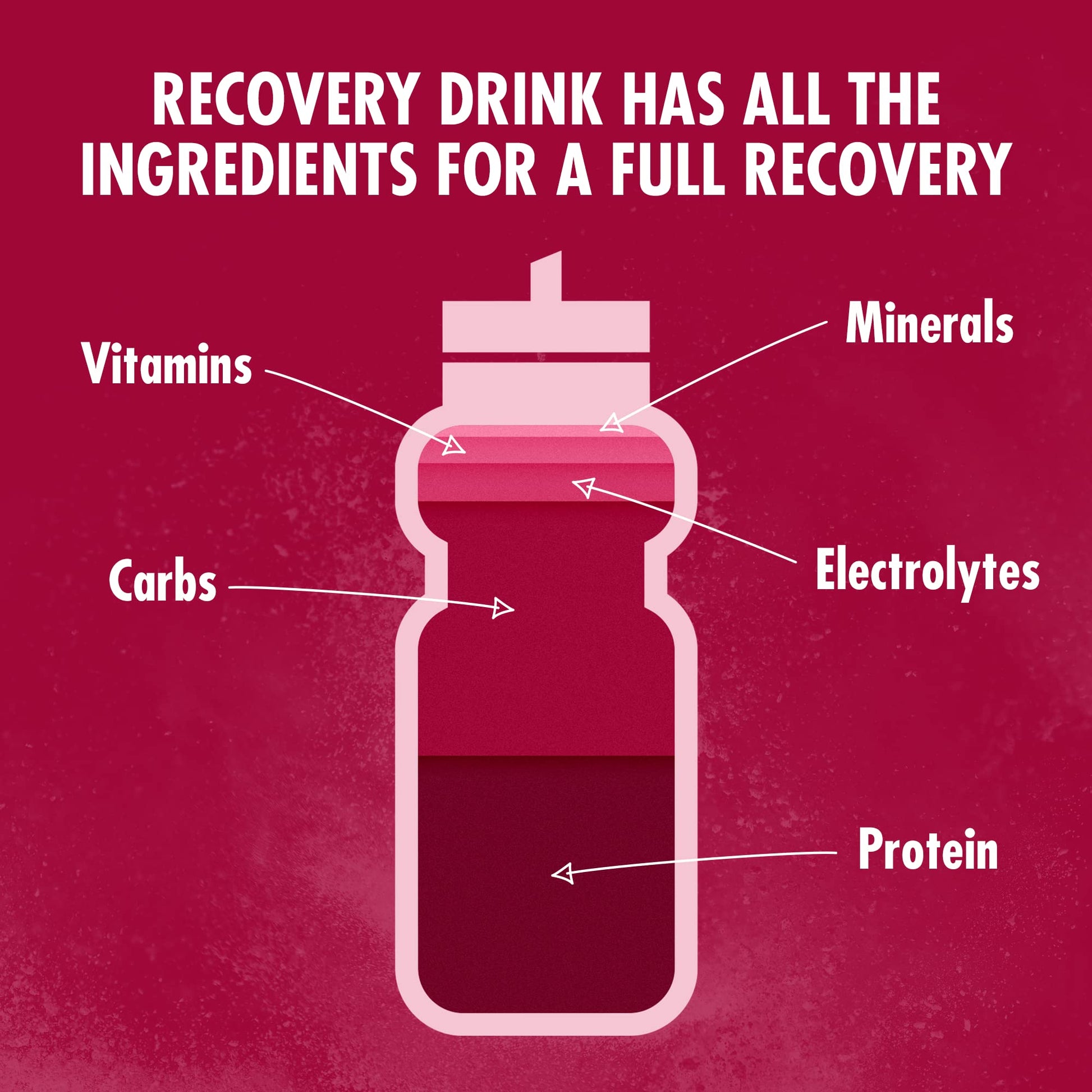 - Recovery Drink contains 20g protein, fast-release carbohydrates, electrolytes, vitamins and minerals in a great-tasting smooth milkshake drink