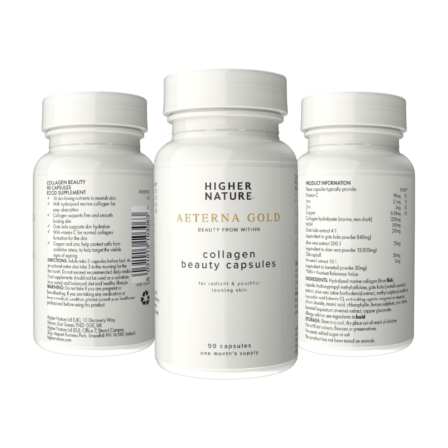 HIGHER NATURE Higher Nature - Æterna Gold Collagen Beauty Capsules - 10 Skin Loving Ingredients - Hydrolysed Marine Collagen - Vitamin C - Responsibly Sourced - 90 Capsules