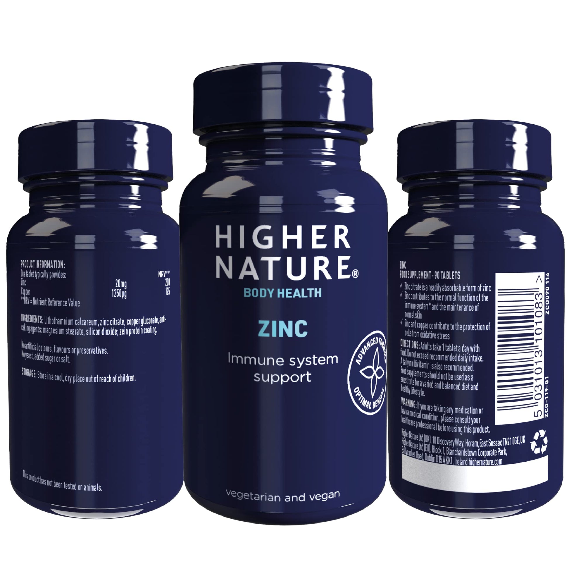 HIGHER NATURE Higher Nature - Zinc - Immune System, Cognitive Function & Fertility Support - Gluten Free - Vegetarian & Vegan - 90 Tablets