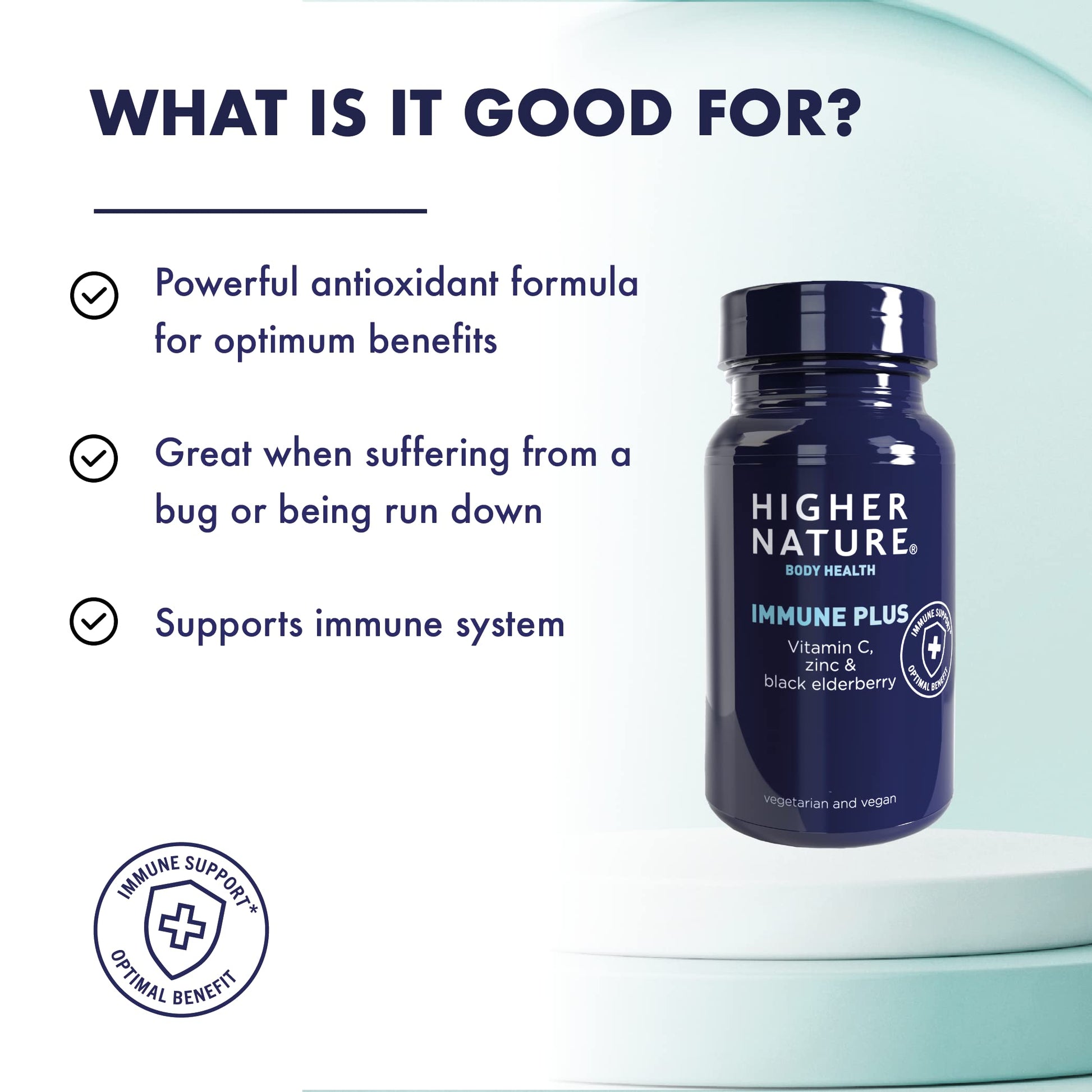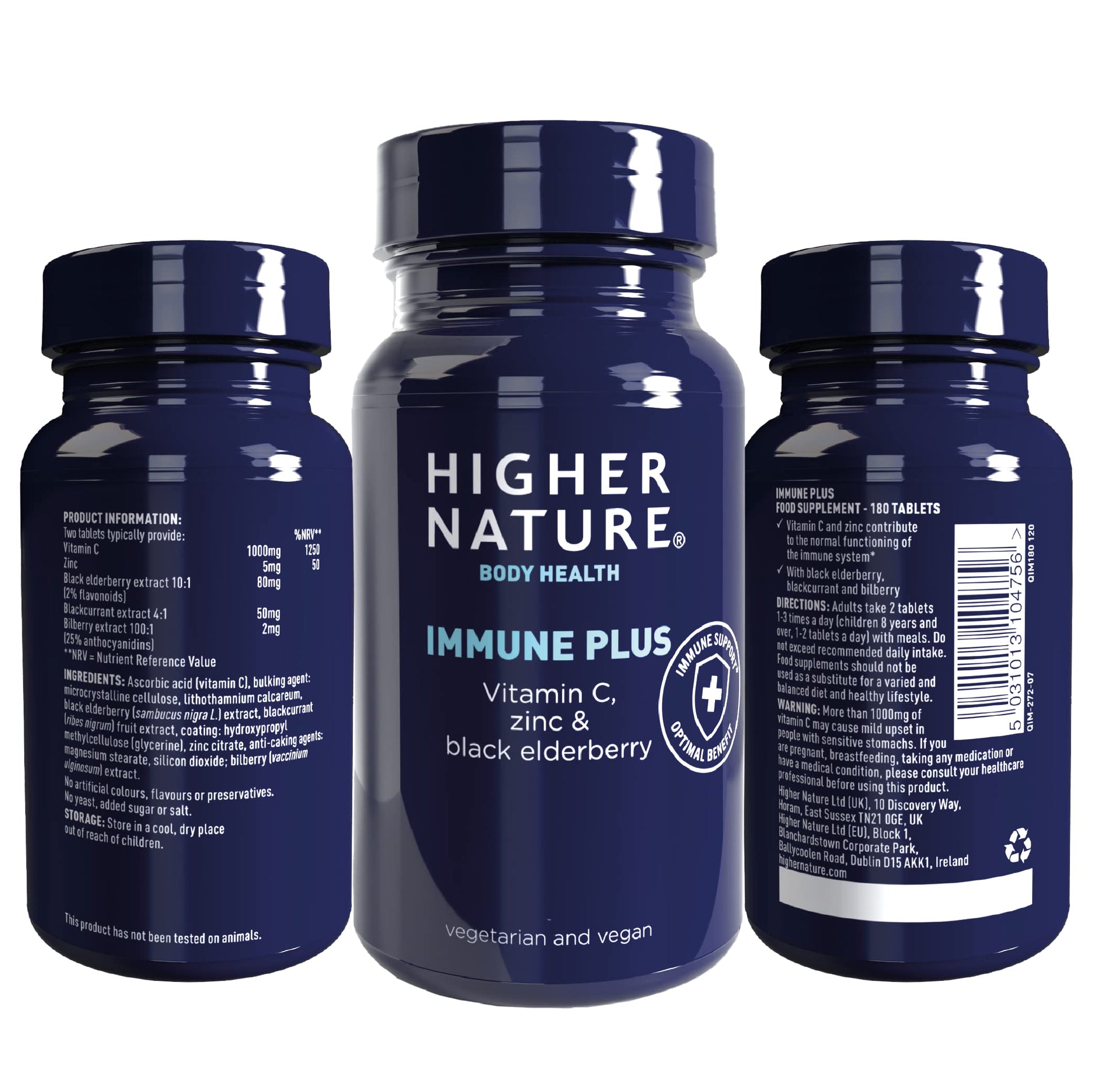 - SUPPORTS IMMUNE SYSTEM: Each tablet of our Immune + has the equivalent of 400mg of black elderberry powder, 100mg of bilberry and 100mg of blackcurrant. It provides high strength essential nutrients Vitamin C and bioavailable Zinc which are crucial for immune function. Additional antioxidants and phytochemicals provide broader support.