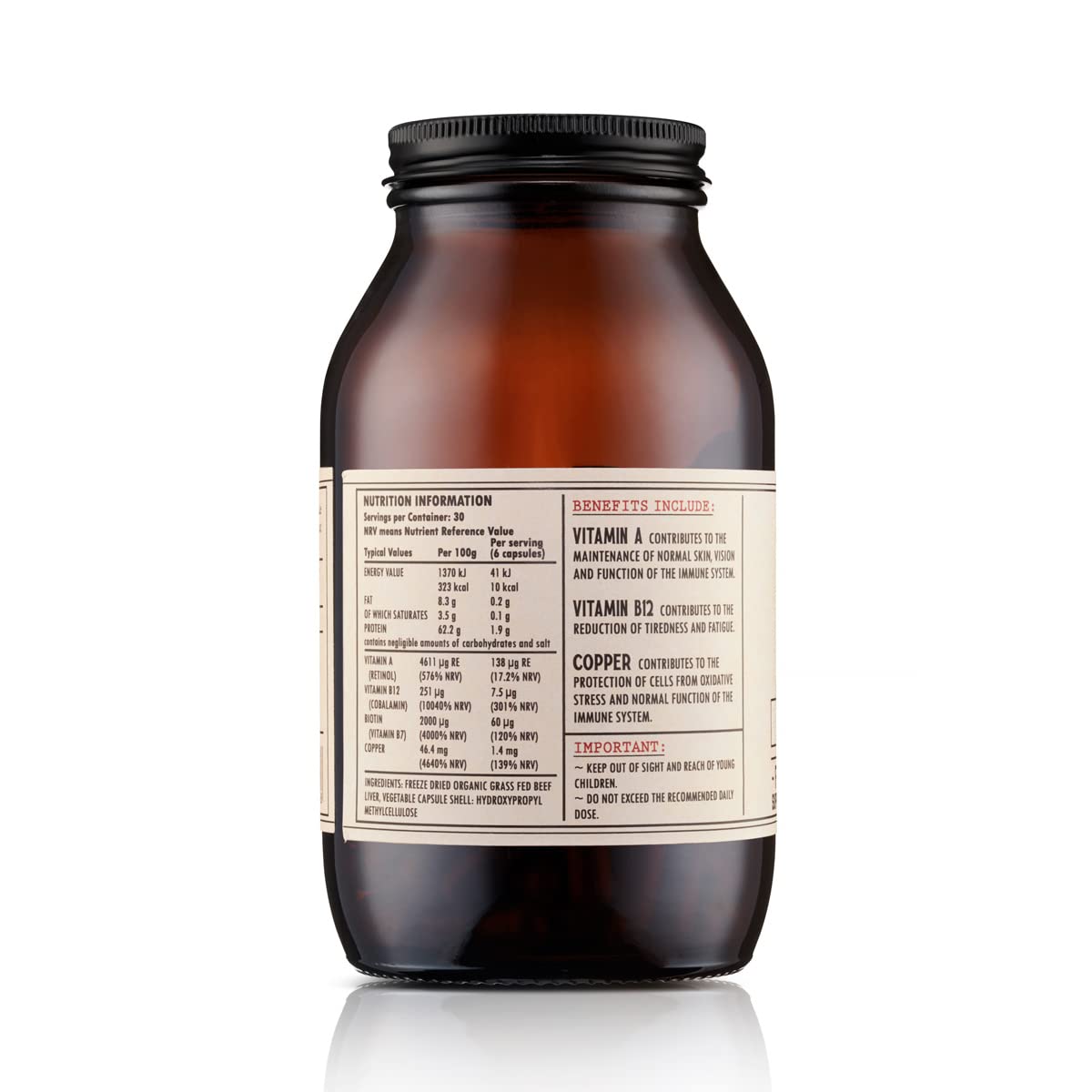 100% PURE BEEF LIVER – absolutely no stearates, lubricants, binders, fillers, flow agents or other additives. CERTIFIED ORGANIC BRITISH INGREDIENTS – sourced from Soil Association certified organic farms in the UK and are hormone, pesticide and GMO free. MAXIMUM NUTRIENTS – produced via a rapid freeze drying process that preserves sensitive vitamins, minerals and co-factors. LAB CERTIFIED TO UK & EU STANDARDS - lab tested as high in vitamin B7, vitamin B12, copper and a source of vitamin A. Each batch is also tested to be free of heavy metals. GLYPHOSATE FREE CERTIFIED - lab tested and certified Glyphosate Free. SUSTAINABLE MATERIALS - supplied in a recyclable glass bottle with aluminium lid. 180 capsules, 500 mg per capsuleMore Info