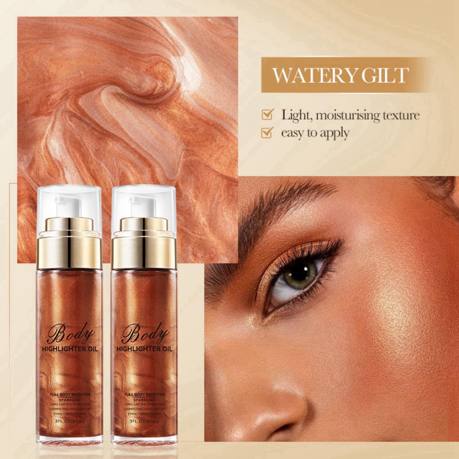 HIVETZ Body Shimmer Oil,Moisturizing Body Highlighter Makeup,Waterproof Liquid Luminizer, Non-Sticky Body Glow Shimmer Lotion,Body Smooth Light Shimmer Glow Oil for Face and Body,80ml (#04-Golden Brown)