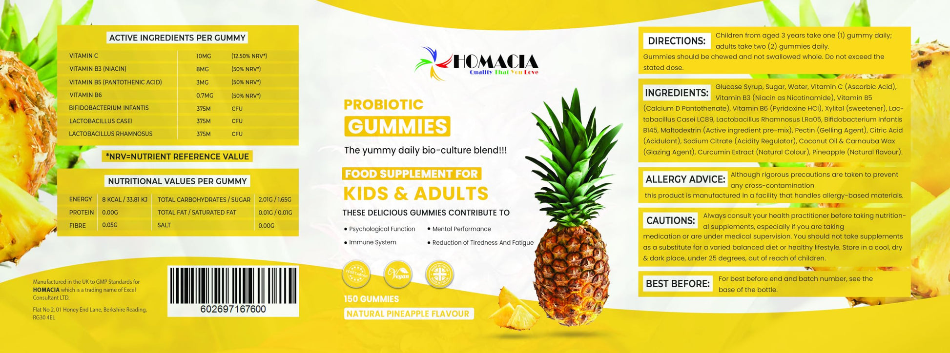 HOMACIA Quality That You love Homacia Kids Probiotic Gummies | 150 Probiotic Gummies for Kids & Adults | Natural Pineapple Flavour with Added Vitamins | Immune Booster for Kids | UK Manufactured Multivitamin Gummies