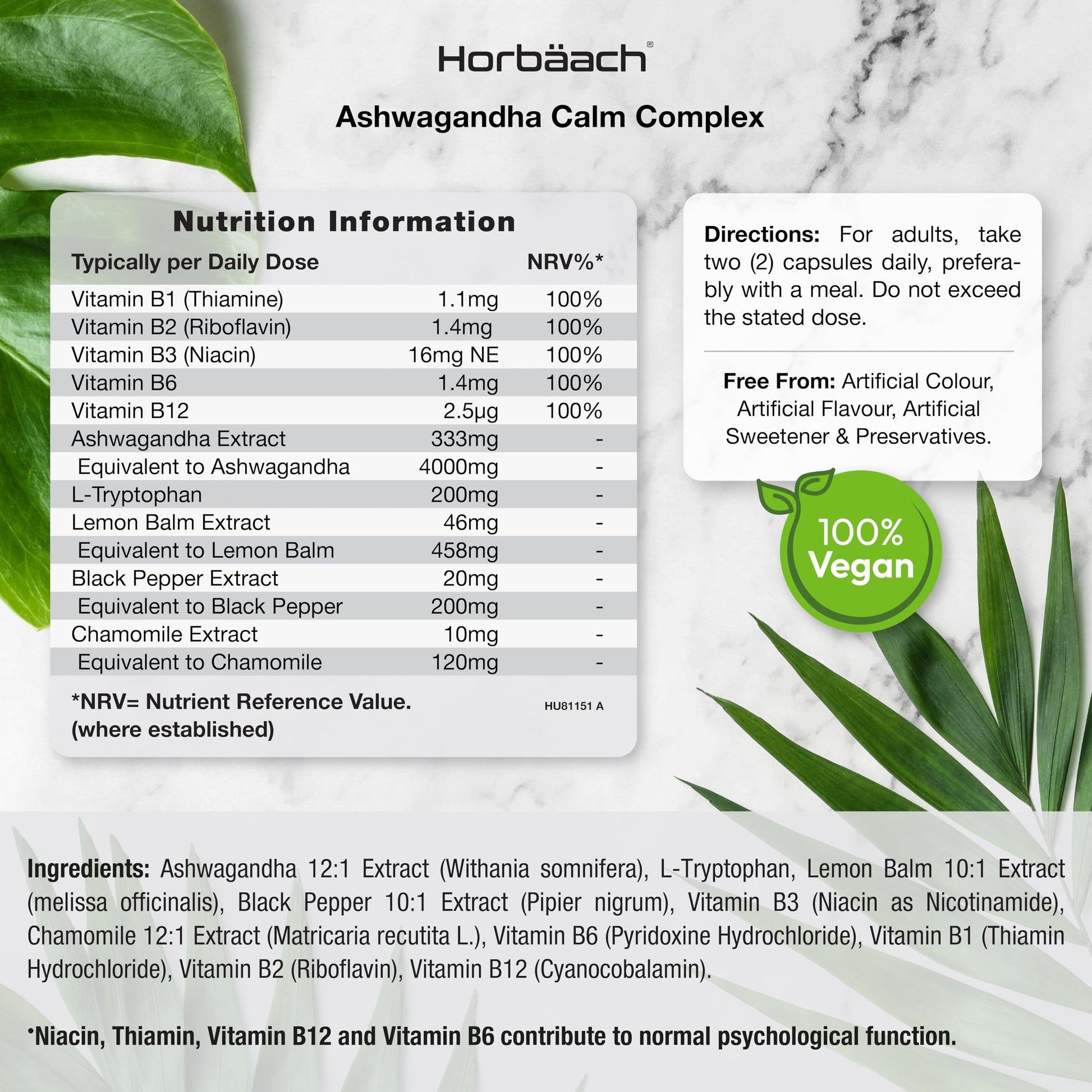Horbäach Ashwagandha Capsules 5000mg | Calm Complex with High Strength B Vitamins (B1, B2, B3, B6 & B12) and Amino Acids | Formula for Men & Women | 60 Vegan Capsules | by Horbaach