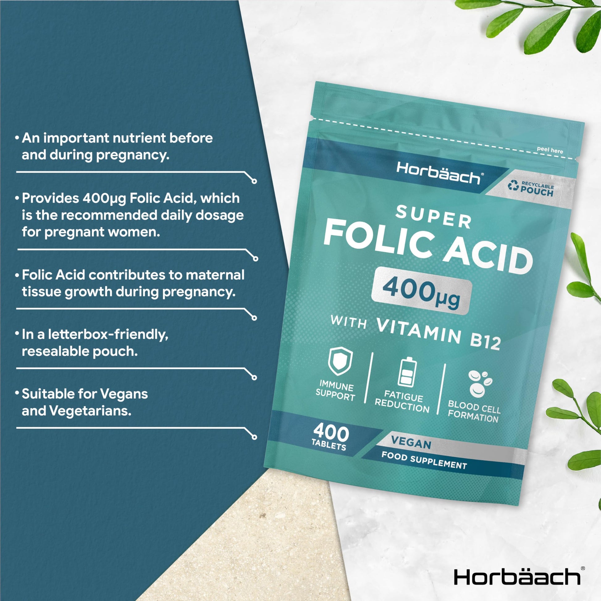Horbäach Folic Acid Tablets 400ug | 400 Count | Super Strength Vegan Supplement with Vitamin B12 Methylcobalamin | No Artificial Preservatives | by Horbaach