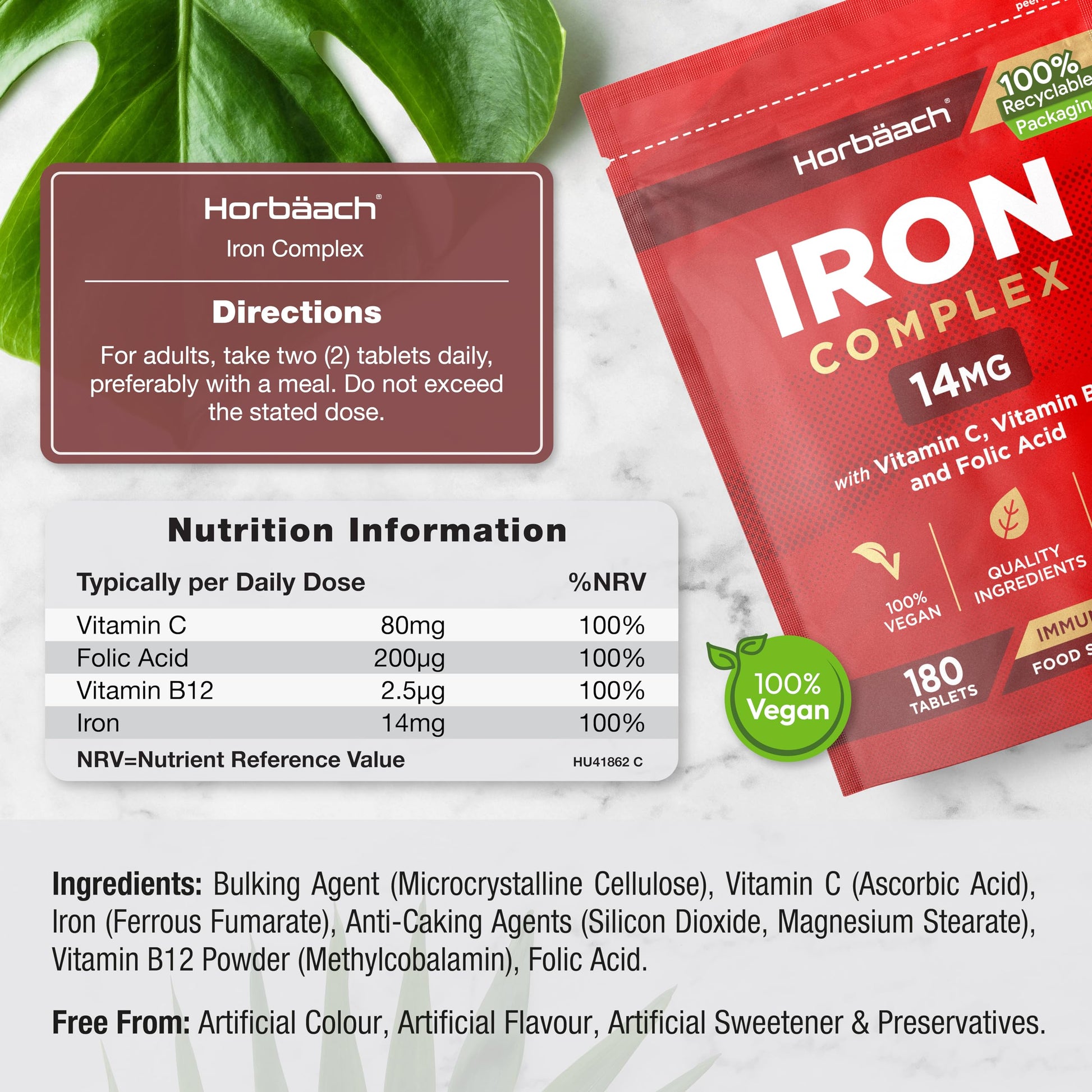 Horbäach Iron Tablets | High Strength Iron with Vitamin C, Folic Acid & Vitamin B12 | Supplement for Men & Women | 180 Vegan Tablets | by Horbaach