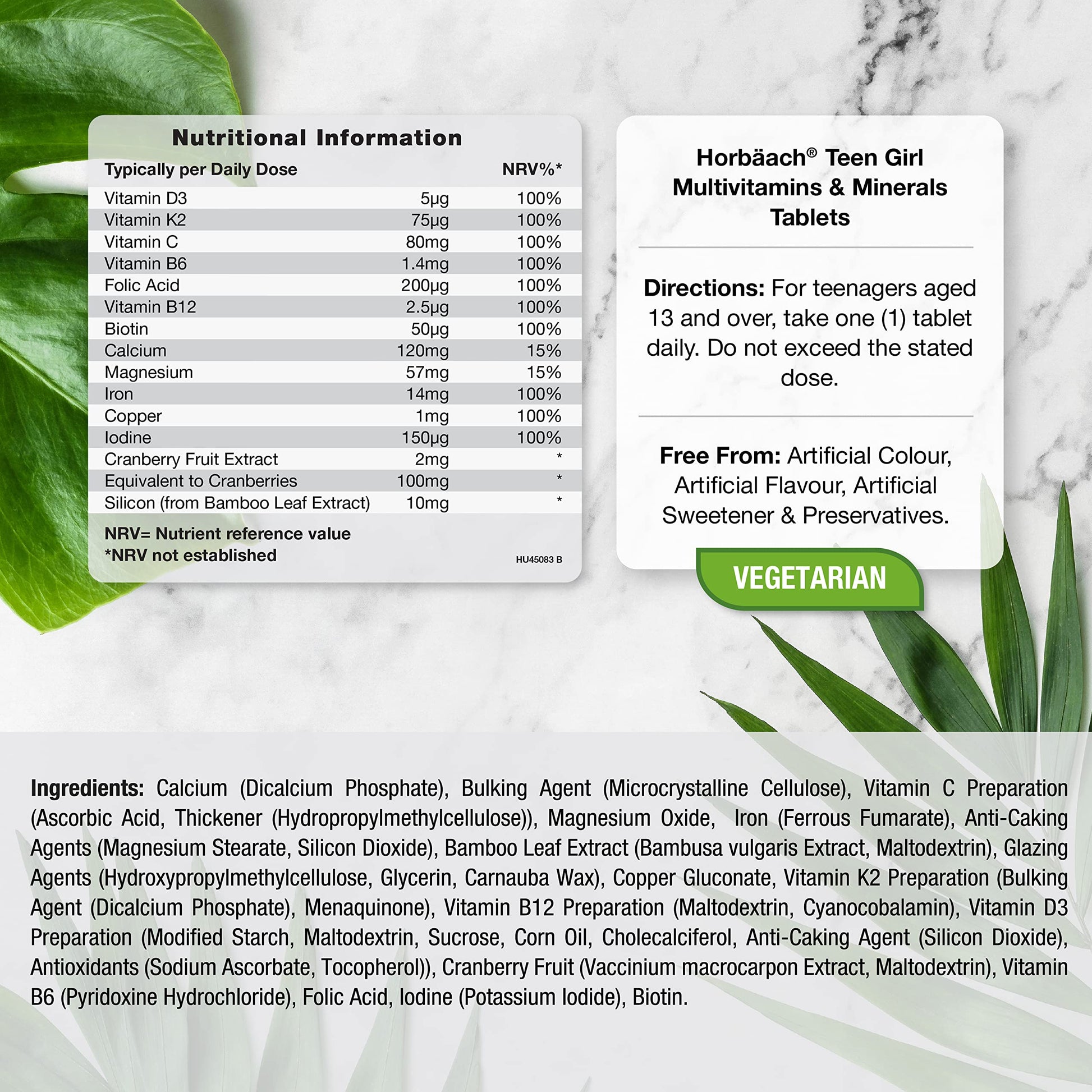Horbaach Teen Girl Multivitamin includes a comprehensive range of high strength vitamins & minerals to help support daily nutritional requirements for young women's health aged 13 to 19 years. With added Vitamin C & B12 that contributes to normal Energy-yielding Metabolism & normal function of the Immune System. Calcium & Vitamin D promotes normal growth and development of bones in children & Biotin that helps with normal hair, skin and nails. In addition, our blend contains B6 (often featured in B Complex products) which contributes to the regulation of hormonal activity & Iron which promotes the normal formation of red blood cells and haemoglobin. Teens undergo rapid growth and iron needs are greater, particularly young women who are menstruating and are at risk for developing iron deficiency. Our product also contains Magnesium, Folic Acid, Iodine, Vitamin K2 & Cranberry which are all known to be beneficial for female health, all in a handy veggie tab. Give a boost to your teen's hectic lifestyle with Horbaach Teen Girl Multivitamin, it's the best formula on the market!More Info