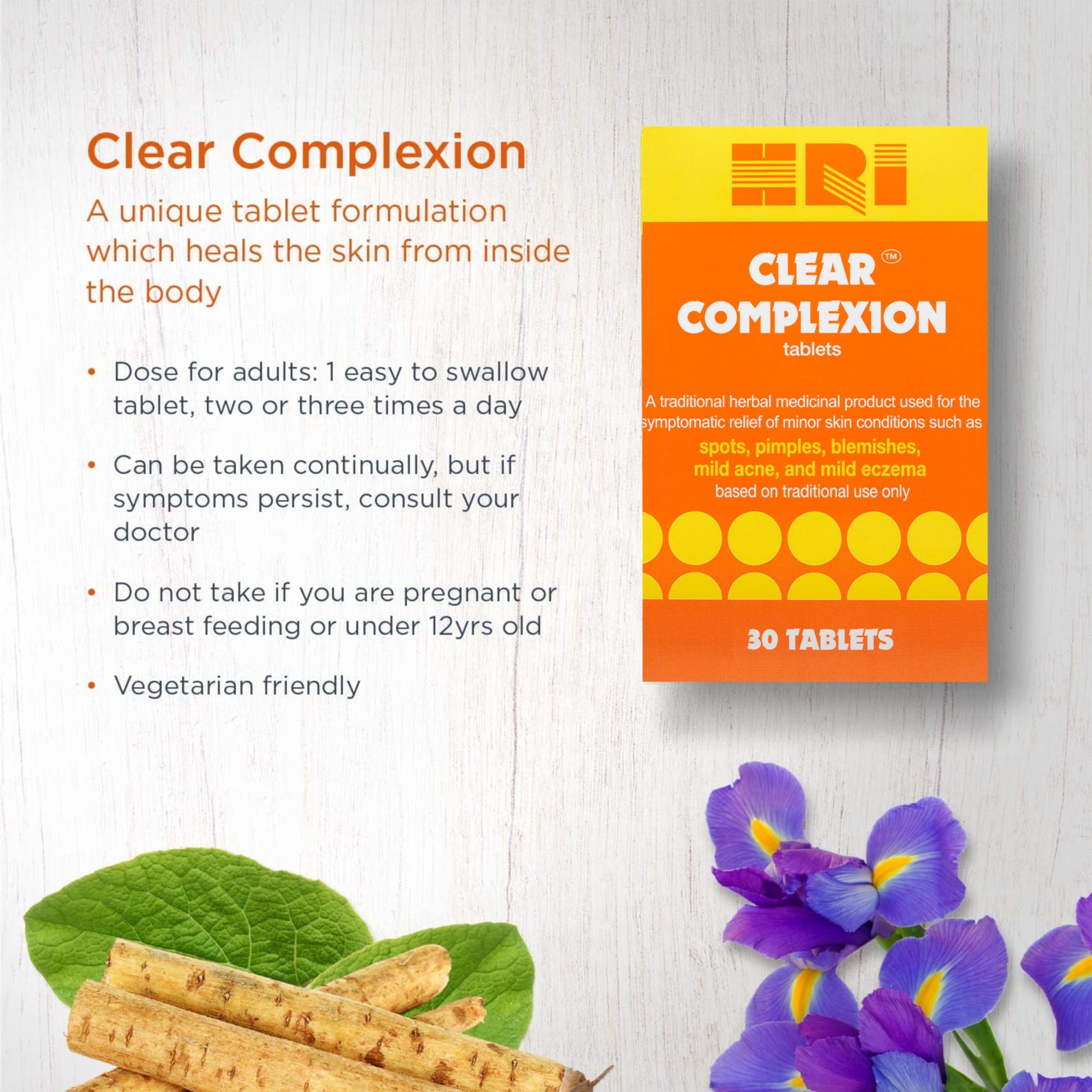 - Beautiful Clear Skin: The natural, active herbs of burdock root and blue flag rhizome in HRI Clear Complexion tablets target mild acne, spots and blemishes. Can be taken acutely to address immediate skin concerns or as part of a proactive clear skin care regimen