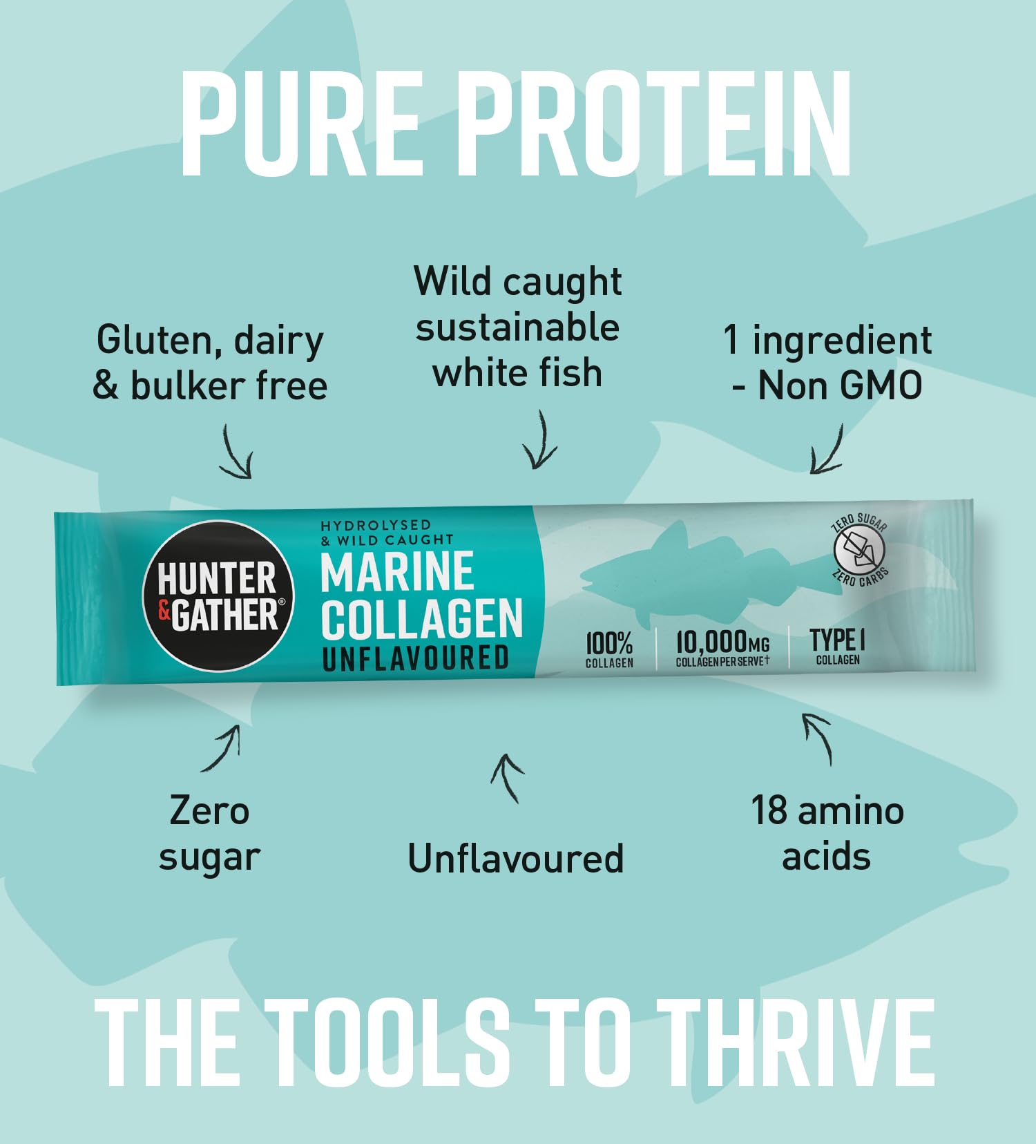 Hunter & Gather Marine Collagen Powder 30 x 5g Sachets | Pure Unflavoured Hydrolysed Wild Caught Marine Collagen Peptides Powder for Hair Skin Nails Muscles | Collagen Supplements for Women and Men