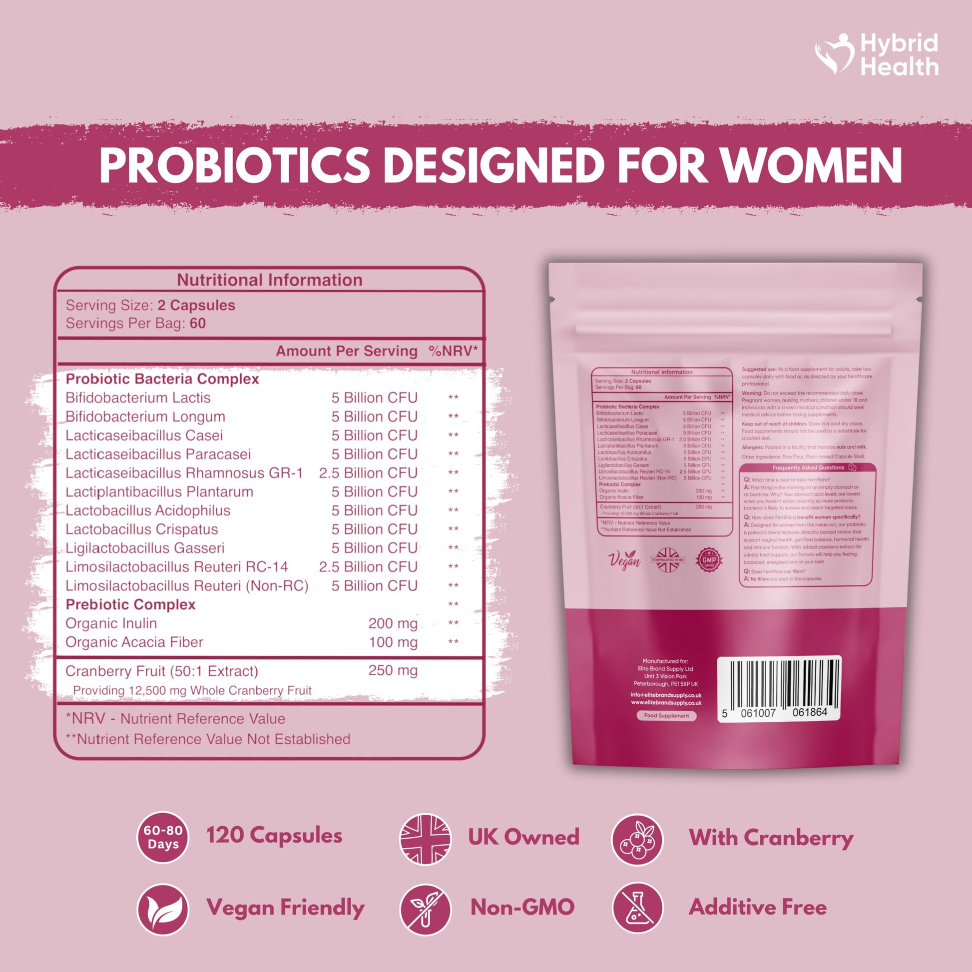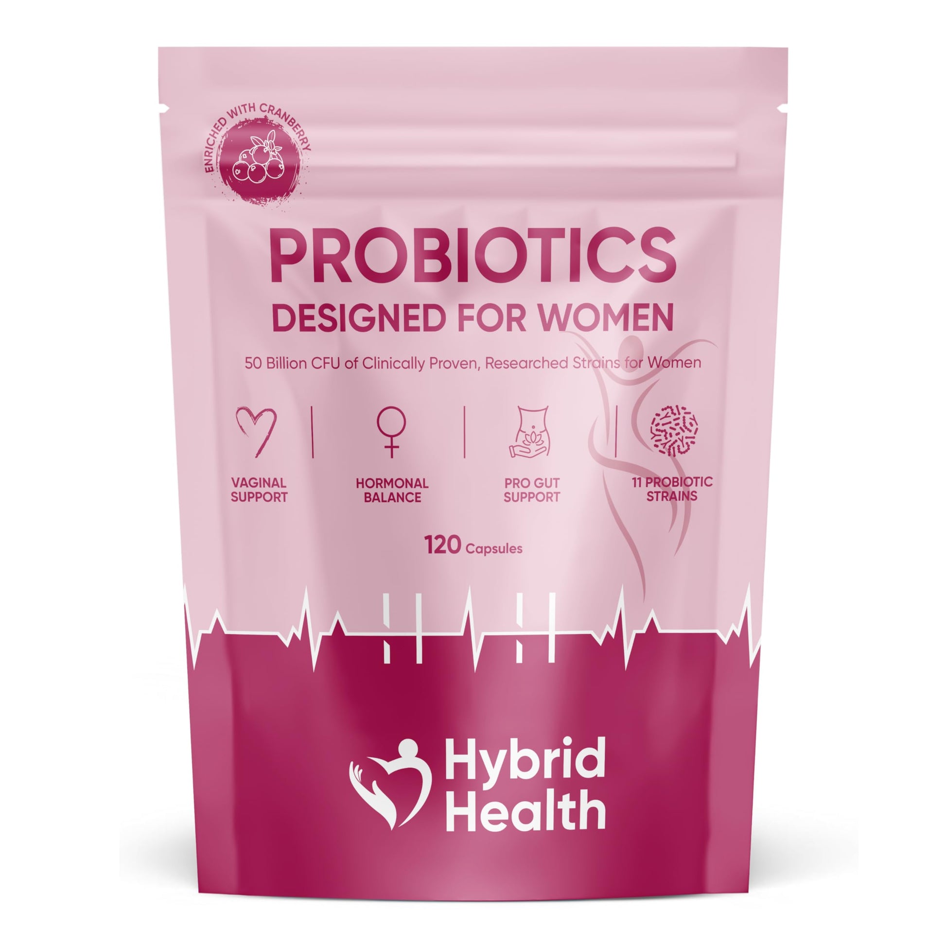 Hybrid Health Probiotics For Women | 120 Vegan Capsules | 50 Billion CFU Womens Probiotics For Gut Health | 11 Probiotic Researched Strains with Prebiotics & Cranberry Extract. SPECIFICALLY FORMULATED FOR WOMEN’S HEALTH: Our advanced pre and probiotics for gut health blend supports feminine wellness, gut health, urinary tract health & digestive balance. featuring 11 diverse researched strains for women (50 Billion CFU), cranberry extract and a nourishing prebiotic complex. Our formula delivers comprehensive daily care to help you feel your best from the inside out. 50 BILLION CFU WITH CRANBERRY & PREBIOTIC SUPPORT: Hybrid Health’s probiotics for women delivers 50 billion live cultures per serving, combined with 12,500mg of potent cranberry extract and 300mg of a targeted prebiotic blend - carefully formulated to support women’s health. UNIQUE QUALITY YOU CAN TRUST: Our women’s probiotic is proudly made without any artificial fillers, additives, or preservatives. it’s 100% vegan, non-gmo and gluten-free - perfect for women seeking a clean, high quality pro biotics for gut health solution without compromising dietary preferences. COMBINED PROBIOTIC COMPLEX FORMULA: Our prebiotic and probiotic supplements offers a complete gut health solution by combining the benefits of both probiotics and prebiotics in one powerful formula. Probiotics introduce beneficial bacteria to your gut, while prebiotics serve as nourishment for these probiotics, helping them thrive and work more effectively. This carefully formulated blend is also enhanced with cranberry extract to help maintain vaginal and urinary tract health. LONG-TERM POTENCY & STABILITY: Hybrid Health’s prebiotics for gut health are expertly formulated to stay effective for up to 2 years without the need for refrigeration. Our shelf-stable design protects the live bacteria, ensuring maximum potency and reliable results from the first capsule to the last.More Info