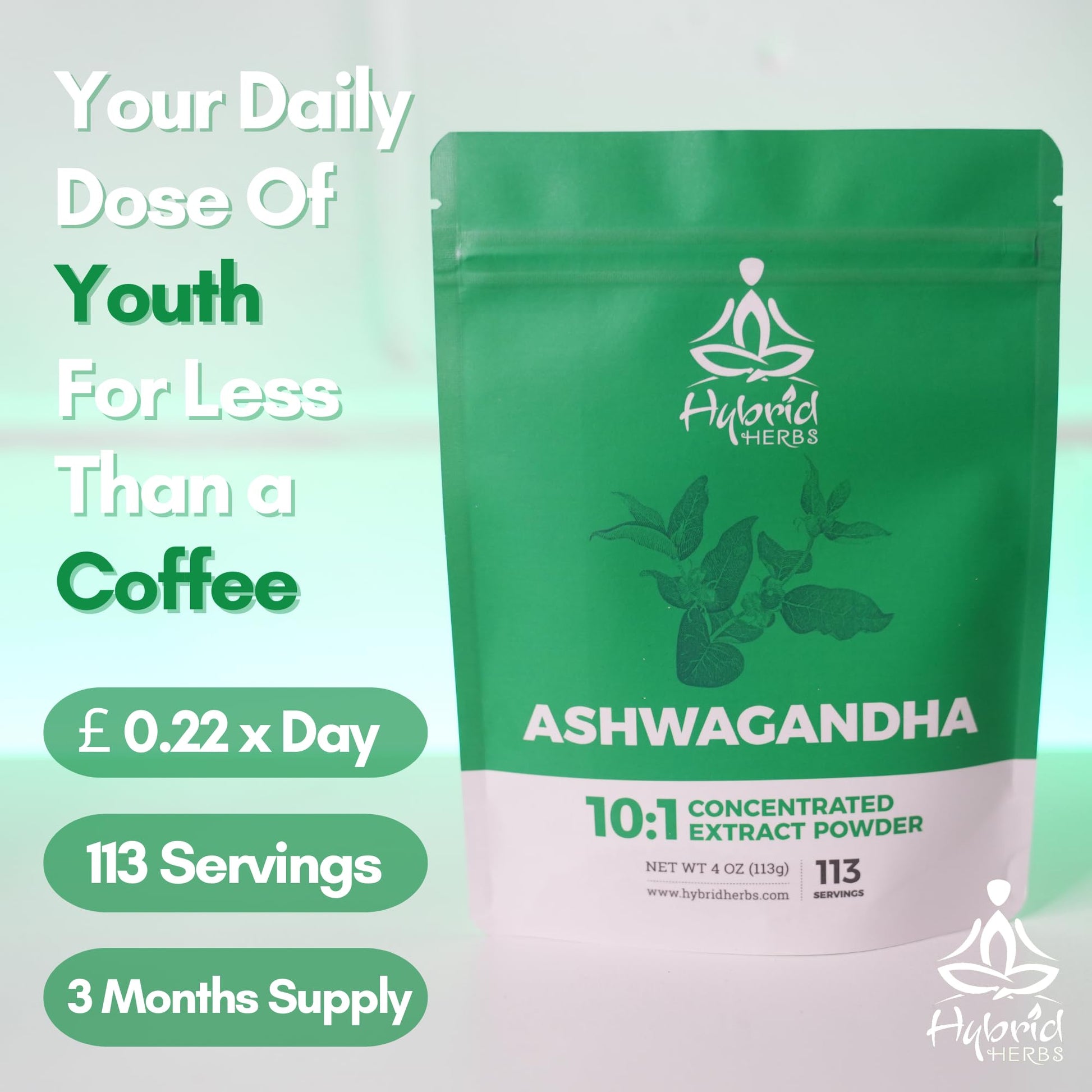 HYBRID HERBS – ASHWAGANDHA ROOT | 10:1 Extract Powder with Withanolides | Adaptogen for Calm, Stress & Sleep Aid | Stamina, Cognitive & Mind Support | 113 servings (113g)