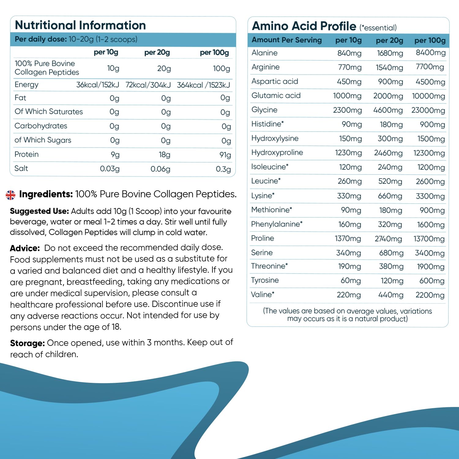 Discover the purity of our 100% Pure Hydrolysate Collagen Peptides Powder, sourced from bovine collagen and carefully processed to ensure the highest quality. Each 500g pouch is packed with 18 amino acids, including 8 essential ones. It provides a clean, simple addition to your daily routine with no added fat, sugar, cholesterol, purines, or additives. Our collagen supplements for women and men go through an advanced hydrolysation process, where the collagen is broken down into smaller, easy-to-mix peptides, making it convenient to blend into your favourite beverages or meals. The unflavoured collagen powder (not collagen capsules or collagen tablets) dissolves effortlessly in hot and warm liquids, so you can enjoy it in your coffee, smoothies, soups, or even plain water without changing the taste or texture. This collagen powder is free from allergens, fillers, and preservatives and is suitable for those following various dietary preferences, such as low-carb, keto, or paleo. Its neutral flavour and easy dissolvability make it a versatile option for adding extra protein and amino acids to your diet without impacting your chosen meals. Ideal for daily use, this collagen powder offers a simple, effective way to supplement your nutrition without the need for additives.More Info