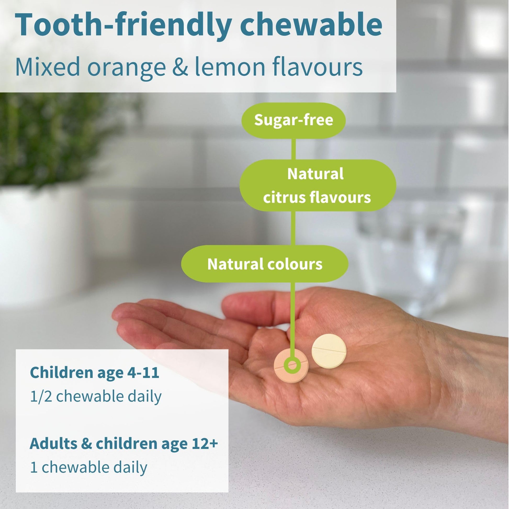 Igennus Vitamin C Chewable contains only hypoallergenic ingredients, with no unnecessary additives. With natural orange and lemon flavours and natural colours, this tooth-friendly formula is sugar-free and contains no artificial sweeteners or preservatives. This clean label supplement has been expertly formulated to provide a gentle and buffered blend of vitamin C, with both sodium ascorbate and ascorbic acid. Combining these two forms enhances bioavailability, as absorption can take place via two uptake pathways. Flexible dosing enables suitable dosing for both kids and adults, for everyday use.More Info