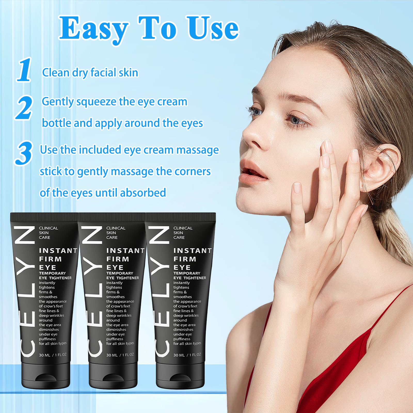 Say goodbye to dark circles, puffiness, fine lines, eye bags, wrinkles, and crow's feet. Our eye tightening cream instant reduces these common eye skin problems, restoring a youthful and energetic appearance to your eyes.