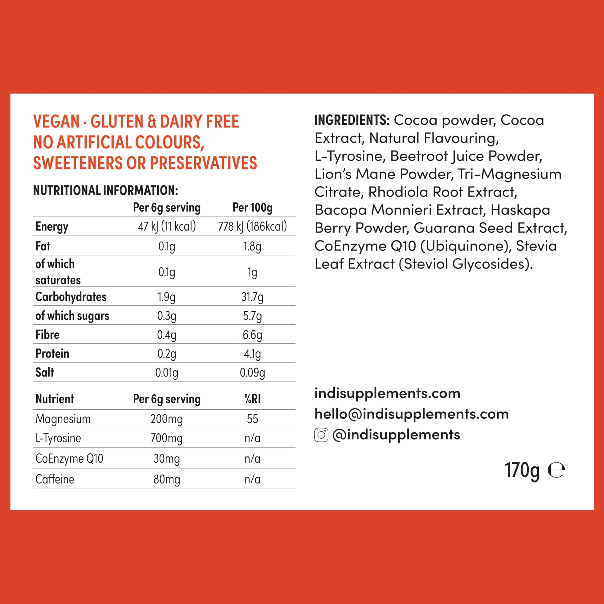 Indi Mind Supplement - Plant-Based Nootropic Powder for Brain Function - Improves Focus, Supports Memory and Combats Fatigue - Cocoa and Berry Flavour - 170g (28 Servings)
