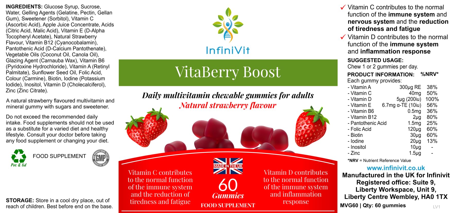Introducing VitaBerry Boost, the perfect daily multivitamin chewable gummies designed specifically for adults. Packed with essential nutrients and boasting a delightful natural strawberry flavor, these gummies make taking your vitamins a truly enjoyable experience. Each gummy in VitaBerry Boost is carefully formulated to provide a comprehensive blend of vital vitamins and minerals. With a single serving, you'll receive a powerful combination of the following essential nutrients: 1. Vitamin A: Supports healthy vision, immune function, and cell growth. 2. Vitamin C: Boosts immune system function and acts as a powerful antioxidant. 3. Vitamin D: Promotes bone health and aids in calcium absorption. 4. Vitamin E: Protects cells from damage caused by free radicals. 5. Vitamin B6: Supports brain function, metabolism, and energy production. 6. Vitamin B12: Essential for nerve cell function and the production of red blood cells. 7. Pantothenic Acid: Helps convert food into energy and supports healthy skin. 8. Folic Acid: Important for DNA synthesis and cell growth. 9. Biotin: Promotes healthy hair, skin, and nails.10. Inositol: Aids in nerve function and promotes mood balance. 12. Zinc: Supports immune system function and overall cellular health. VitaBerry Boost is perfect for both men and women looking for a convenient way to supplement their daily nutritional needs. These chewable gummies offer a delicious alternative to traditional vitamin pills, making them ideal for those who struggle with swallowing tablets or capsules. Whether you're a busy professional, an on-the-go parent, or simply someone who values their health and well-being, VitaBerry Boost provides the essential nutrients your body needs in a convenient and enjoyable form. Say goodbye to dull and hard-to-swallow pills and say hello to these delectable multivitamin gummies.More Info
