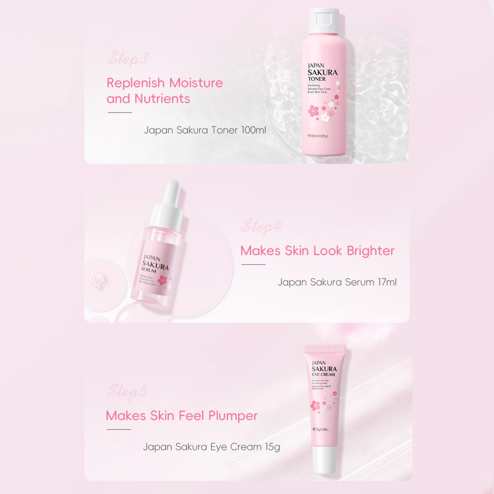<p><strong>Product Name: Sakura Skincare Set</strong></p><p>Usage: Keep skin moist, anti-aging, reduce redness and dryness, reduce acne, blackheads and spots.</p><p>Shelf life: 3 years</p><p><br></p><p><br></p><p><strong>GIFT SET PACKAGE INCLUDED</strong></p><p><br></p><p>A: 4 pcs (50g cleanser + 17ml serum + 15g eye cream + 25g face cream)</p><p>B: 7 pcs (50g cleanser + 75g mud mask + 100ml toner + 17ml serum + 15g eye cream + 25g face cream + 30g sunscreen)</p><p>C: 6 pcs (50g cleanser + 100ml toner + 17ml serum + 15g eye cream + 25g face cream + 30g sunscreen)</p><p>D: 6 pcs (50g cleanser + 100ml toner + 17ml serum + 15g eye cream + 100ml lotion + 25g face cream)</p><p>E: Travel set 3 pcs (17ml serum + 15g eye cream + 30g face cream)</p><p>F: Travel set 4 pcs (20g cleanser + 20ml toner + 8g face cream + 8g sunscreen)</p><p><br></p><p><strong>Tips:</strong></p><p>1.For external use only and avoid to use on broken or damaged skin.</p><p>2.Discontinue use if redness or irritation occurs and consult with your doctor</p><p>3.Avoid direct contact with eyes. if contact occurs, rinse well with water.</p><p>4.Keep out of reach of children.</p><p>5.Store in a cool place and avoid direct sunlight.</p>