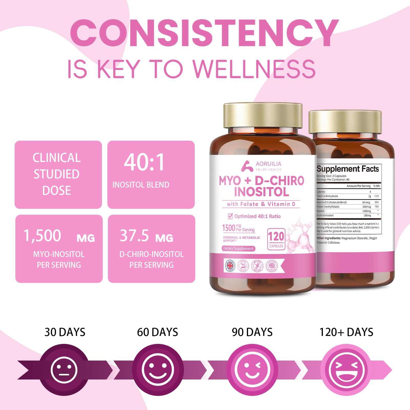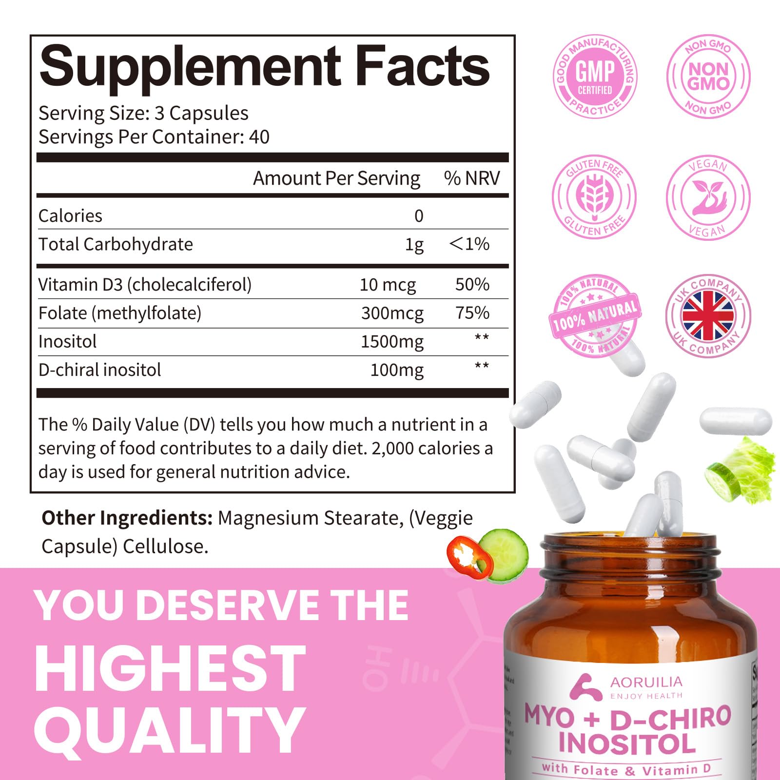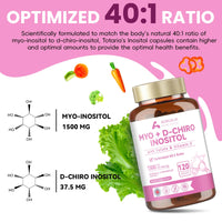 Inositol Supplement for Women with Ratio Myo-Inositol 1500mg & D-Chiro Inositol 37.5mg per Serving - Ideal 40:1 Ratio, Vitamin B8 Inositol Capsules with Folate&VIT D3 for Hormones & Ovarian, 120 Caps