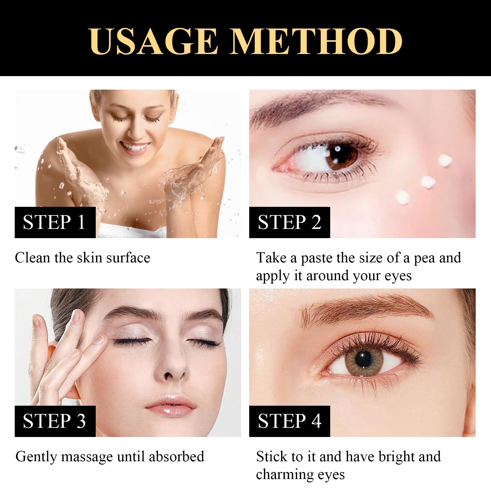 Using instant eye tightening cream is simple and convenient.Just apply a small amount of face cream under the eyes and gently massage until it is completely absorbed.For best results, use it as part of your daily skin care routine, morning and night.