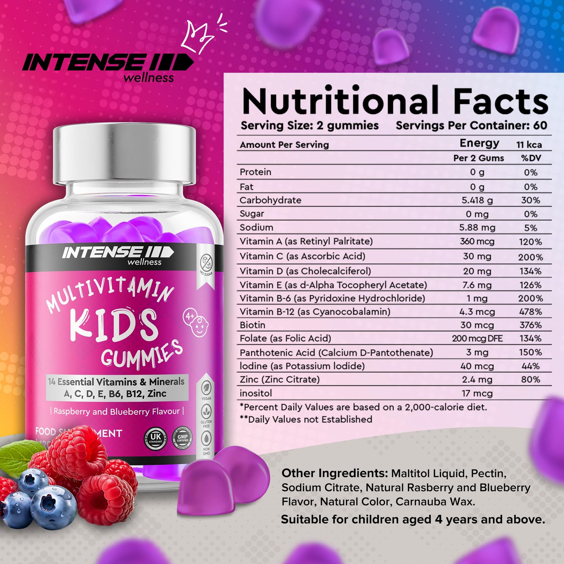 Intense Wellness INTENSE Wellness Multivitamin Gummies for Kids - Vegan Gummies with 14 Vitamins, Minerals, B6, B12 - Raspberry/Blueberry Flavour - Healthy Multi Gummies Boost Immunity, Bone Health, more - 120 Gummies