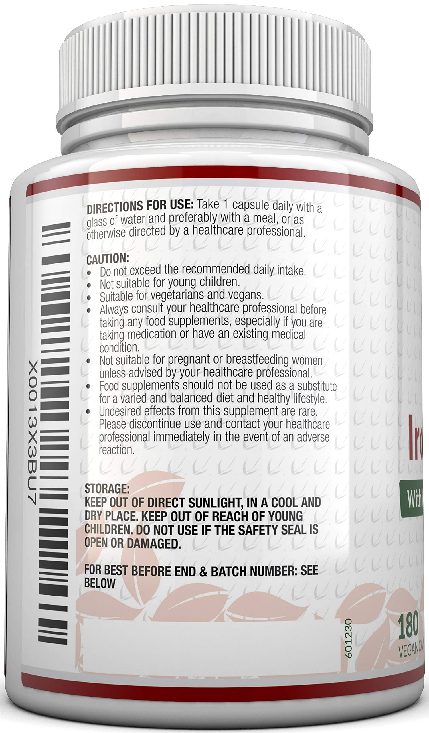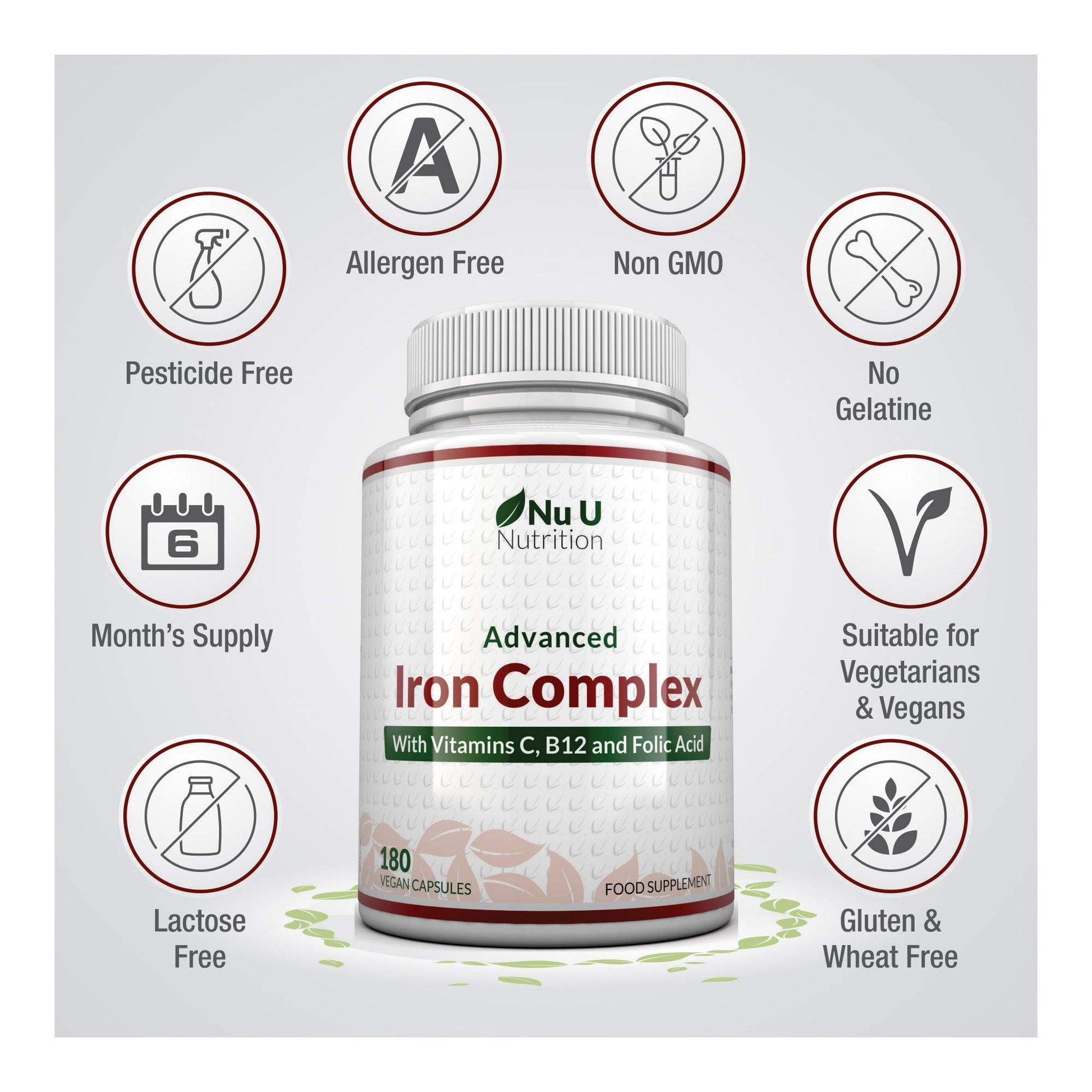Why is Iron Important to our Diets?Iron is an essential mineral, which our body cannot produce by itself, it must instead come from our diet. It is required by the body for so many key functions from the production of healthy red blood cells, to the transportation of oxygen and nutrients around the body. It is vitally important in contributing to a normal energy-yielding metabolism. Being deficient in iron can leave you feeling tired and fatigued and will also result in a weaker immune system.Most of us don’t get enough Iron in our diets, in particular those who follow a meat-free diet which makes supplementation advisable.Our advanced complex has been carefully formulated to also include: vitamin C which helps increase iron absorption; vitamin B12 which contributes to normal red blood cell formation, the reduction of tiredness and fatigue and a normal energy-yielding metabolism.Why Buy Nu U Nutrition Advanced Iron Complex?* VALUE - We offer 180 capsules per bottle, which is on average 50% more than other supplements.* HIGH STRENGTH - Nu U Nutrition's Advanced Iron Complex contains 100% of your NRV of Iron.* FREE FROM ALLERGENS & ADDITIVES - For increased peace of mind, our capsules are Non-GMO and free of allergens including gluten, lactose, soy, eggs, crustaceans and nuts.* No questions asked, feel the benefit. We want you to be satisfied!* PREMIUM QUALITY- Our manufacturing is compliant with recognised global industry practices including: GMP, HACCP, ISO 9001 & Global Food Safety standards, giving you the ultimate peace of mind.More Info