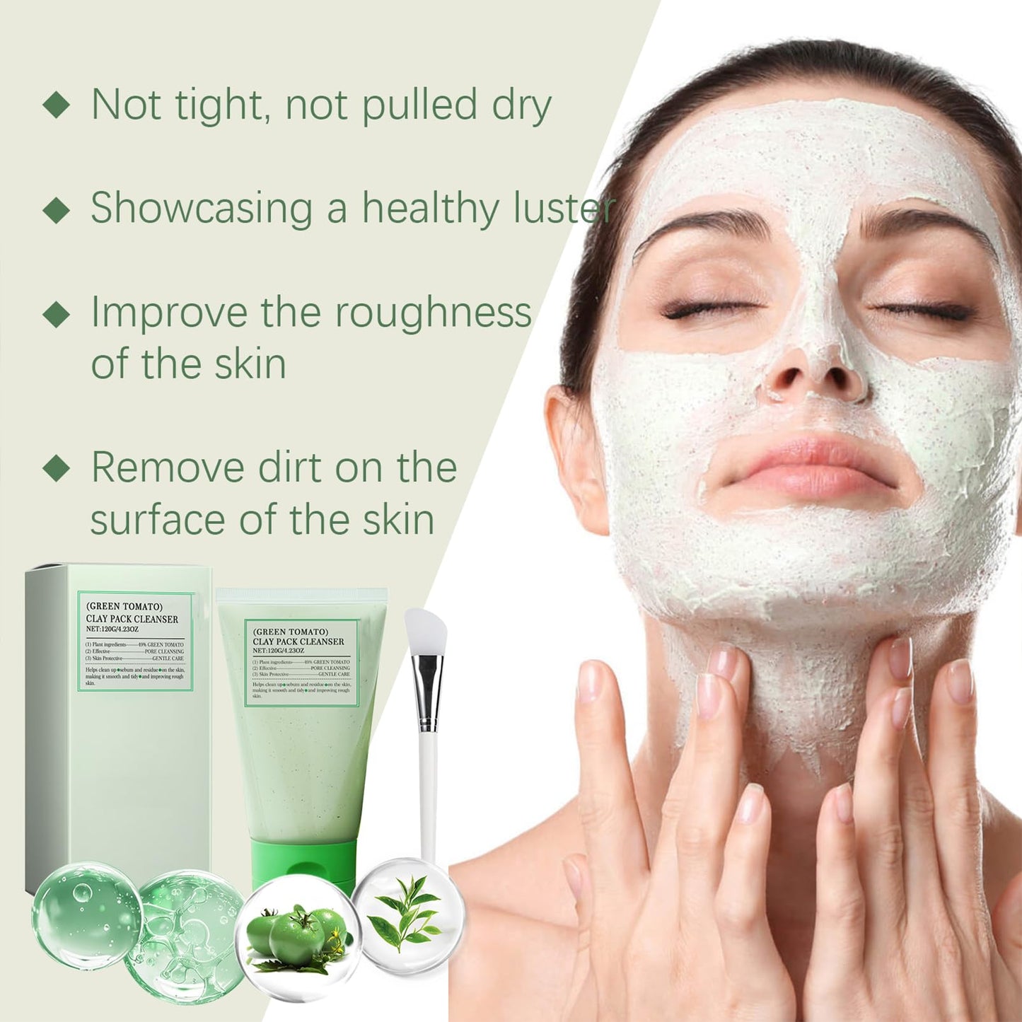 Our fully green tomato clay mask face cleanser comes with an applicator to avoid touching the mud mask with your hands during application. Use an applicator to apply the skin care mud mask to the face to ensure a clean and hygienic skin care process.