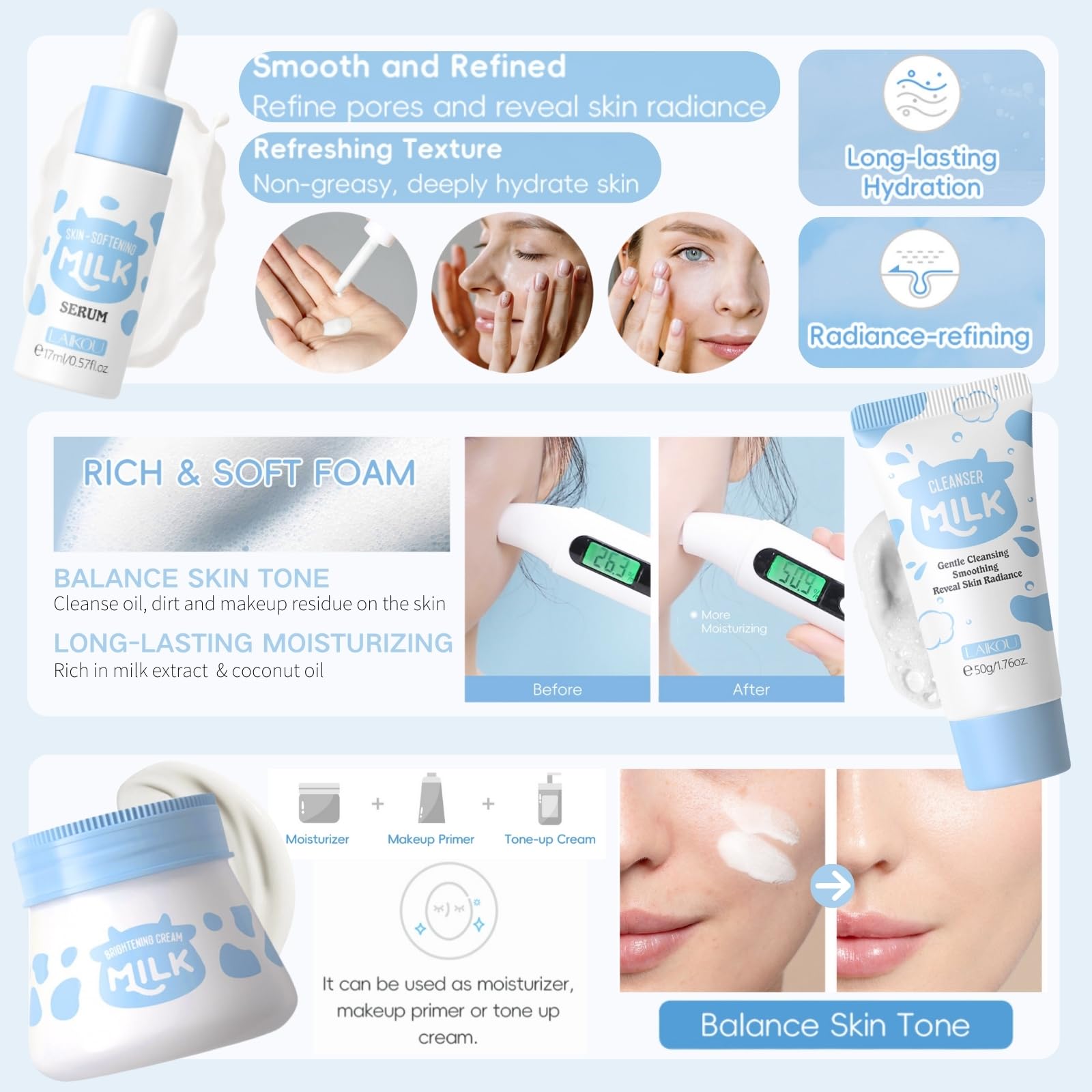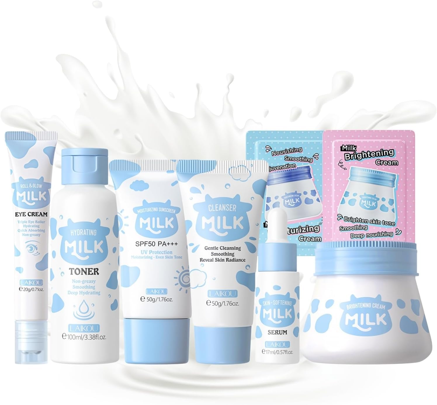 Indulge your skin with the nourishing benefits of milk with this complete milk skincare set, designed to hydrate and restore your skin’s natural radiance. This 8-piece collection offers everything you need for a comprehensive skincare routine, targeting dryness, uneven skin tone, and skin texture.