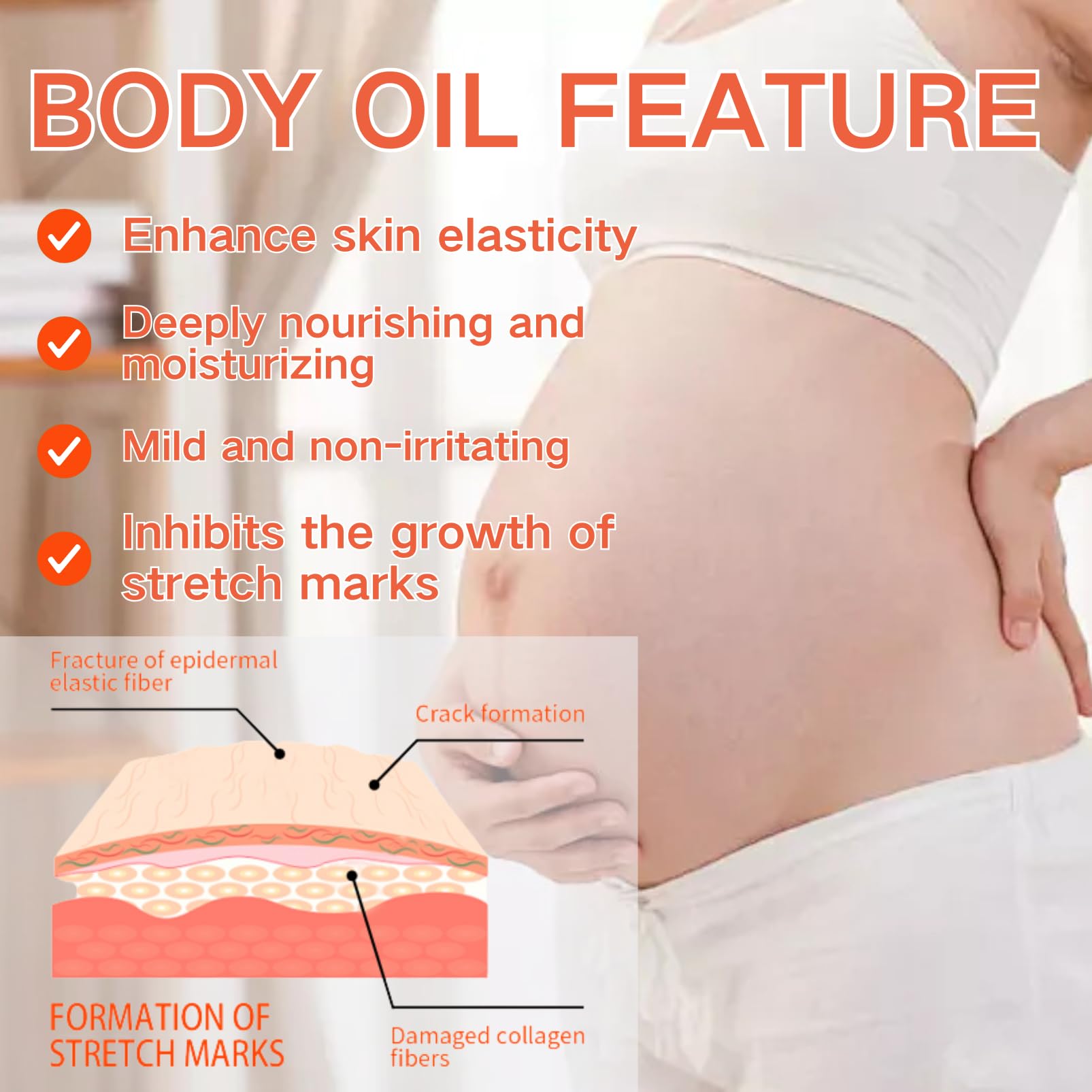 Apply the stretch scar mark removal Body Oil: Take an appropriate amount of body oil into your palm and gently massage into the targeted areas, such as the abdomen, hips, thighs, or anywhere needing extra care.