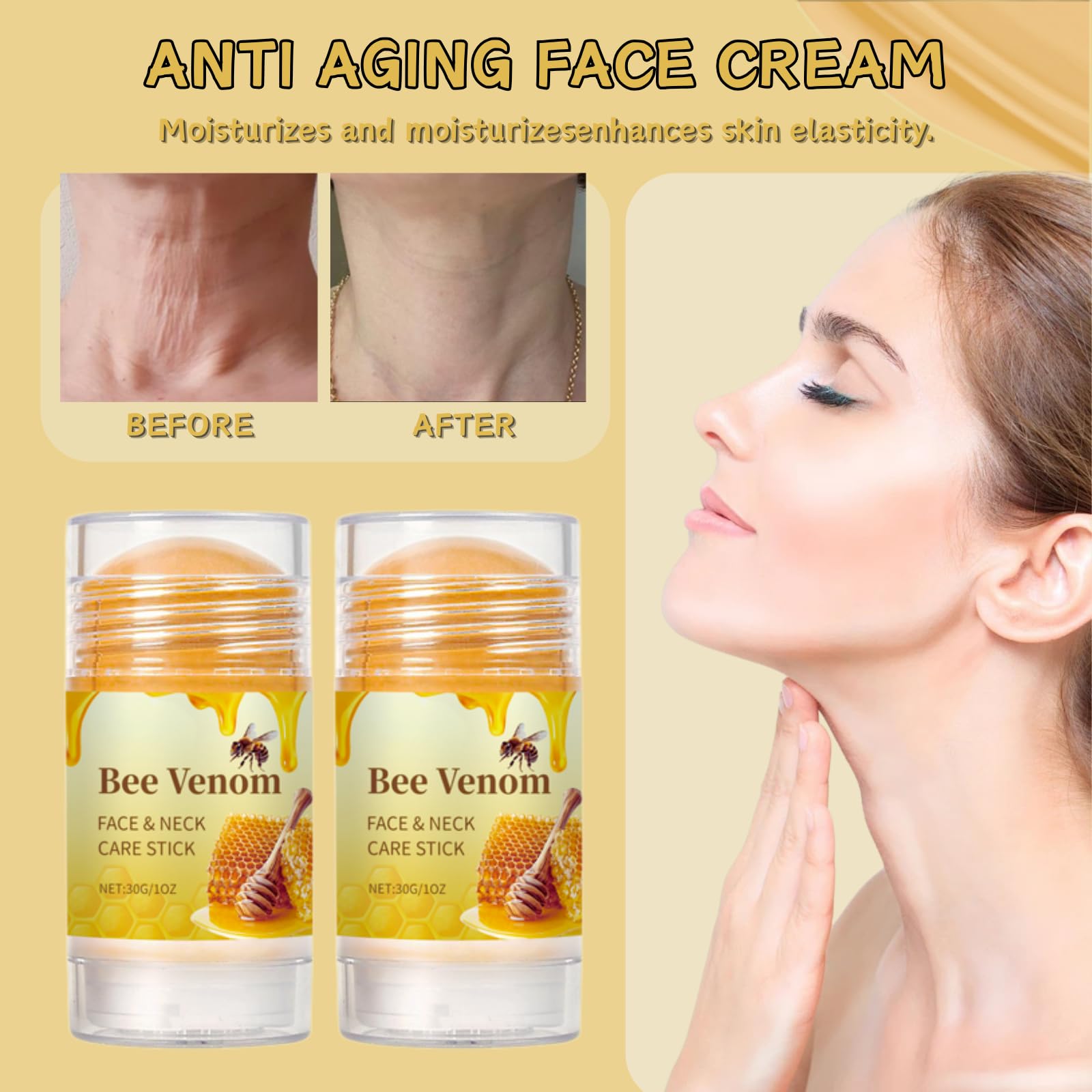 Product Introduction:Experience revolutionary care with this multi-action skin tightening cream for face and neck, formulated to combat visible signs of aging. Powered by bee venom peptides and nourishing botanicals, it acts as a wrinkle filler while delivering the benefits of a brightening serum. The innovative firming serum stick design ensures precise application for stubborn areas like double chin and jawline.