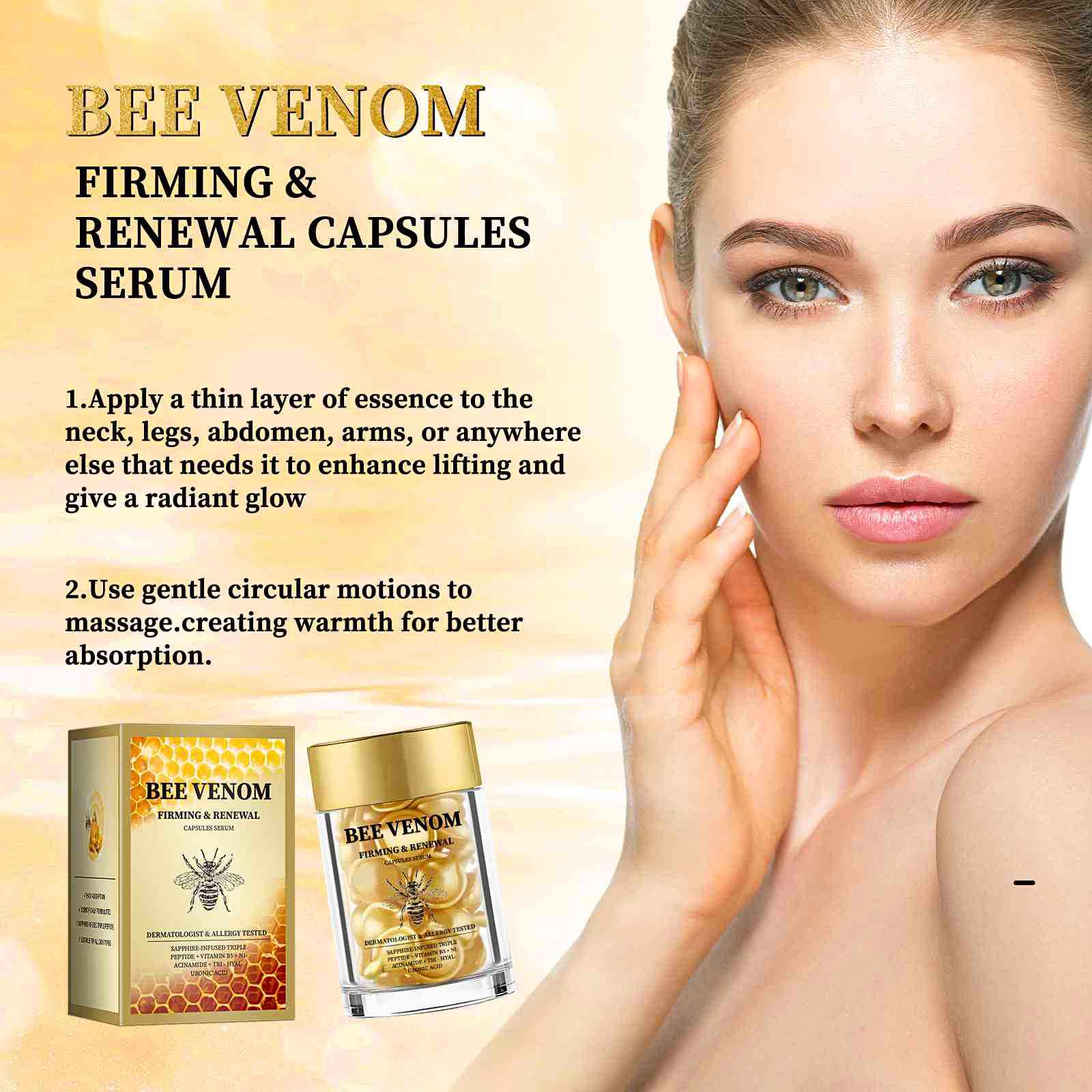 Introducing the Bee Venom Firming & Renewal Capsule Serum – a natural formula delivering instant contouring and long-term rejuvenation for face & body: