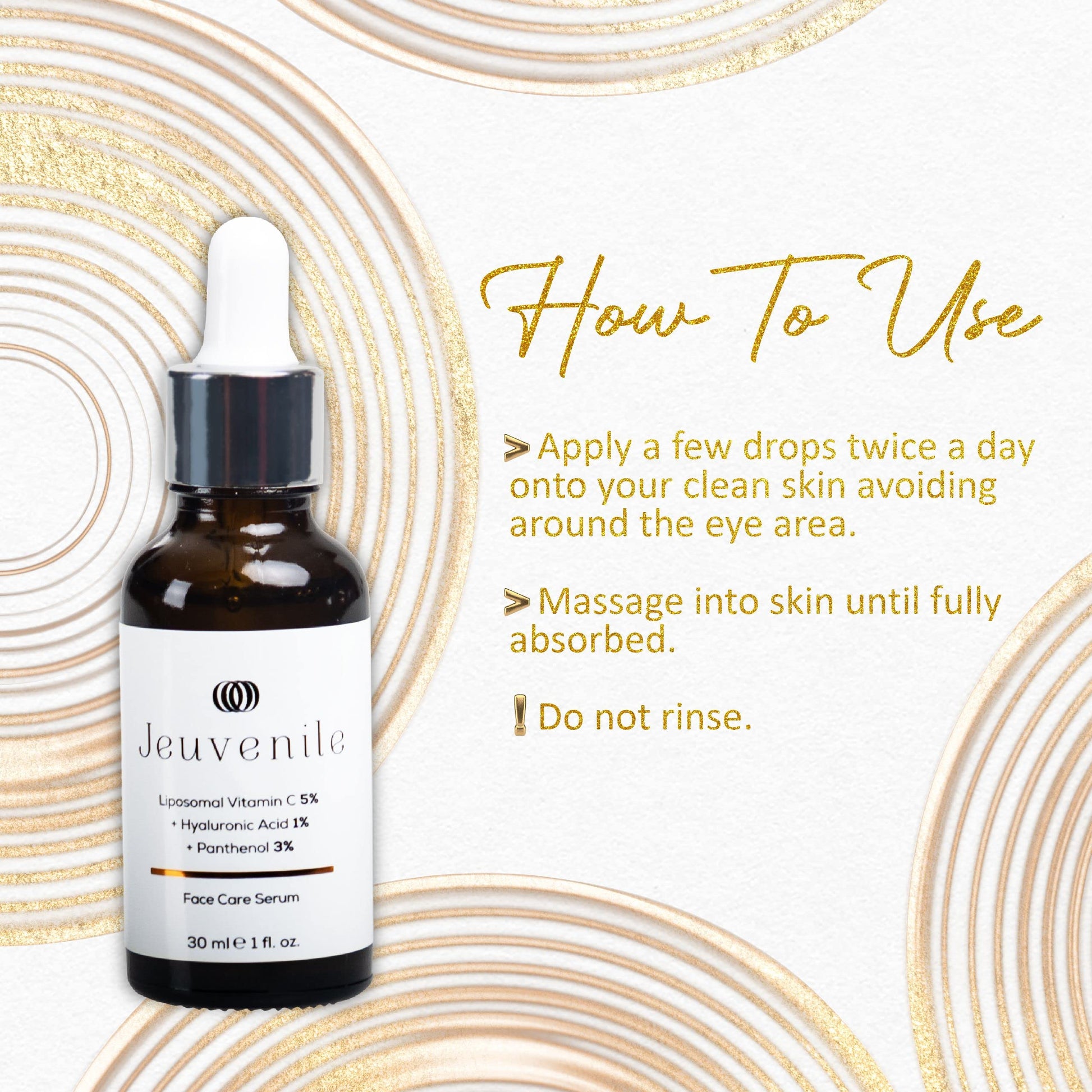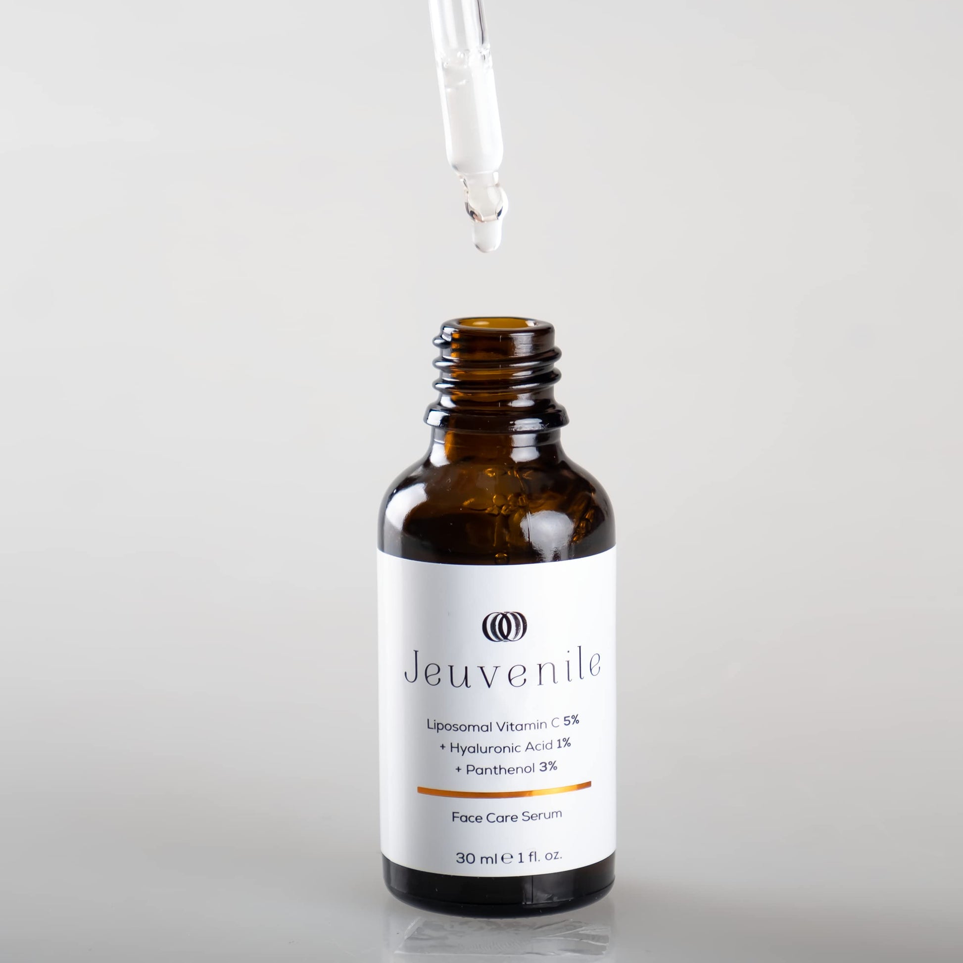 Transform your skincare routine with the Jeuvenile Liposomal Vitamin C5% + Hyaluronic Acid 1% + Panthenol 3% Face Care Serum. Specially formulated to enhance skin brightness and vitality, this serum combines the power of Vitamin C, Hyaluronic Acid, and Panthenol to deliver remarkable results. Vitamin C promotes a radiant complexion by diminishing dark spots and promoting collagen production, while Hyaluronic Acid deeply moisturizes, leaving skin supple and hydrated. Panthenol works to defend against visible signs of aging, ensuring a smooth, youthful appearance. Apply nightly to cleansed skin for optimal results. For external use only. Avoid contact with eyes. Keep out of reach of children.More Info