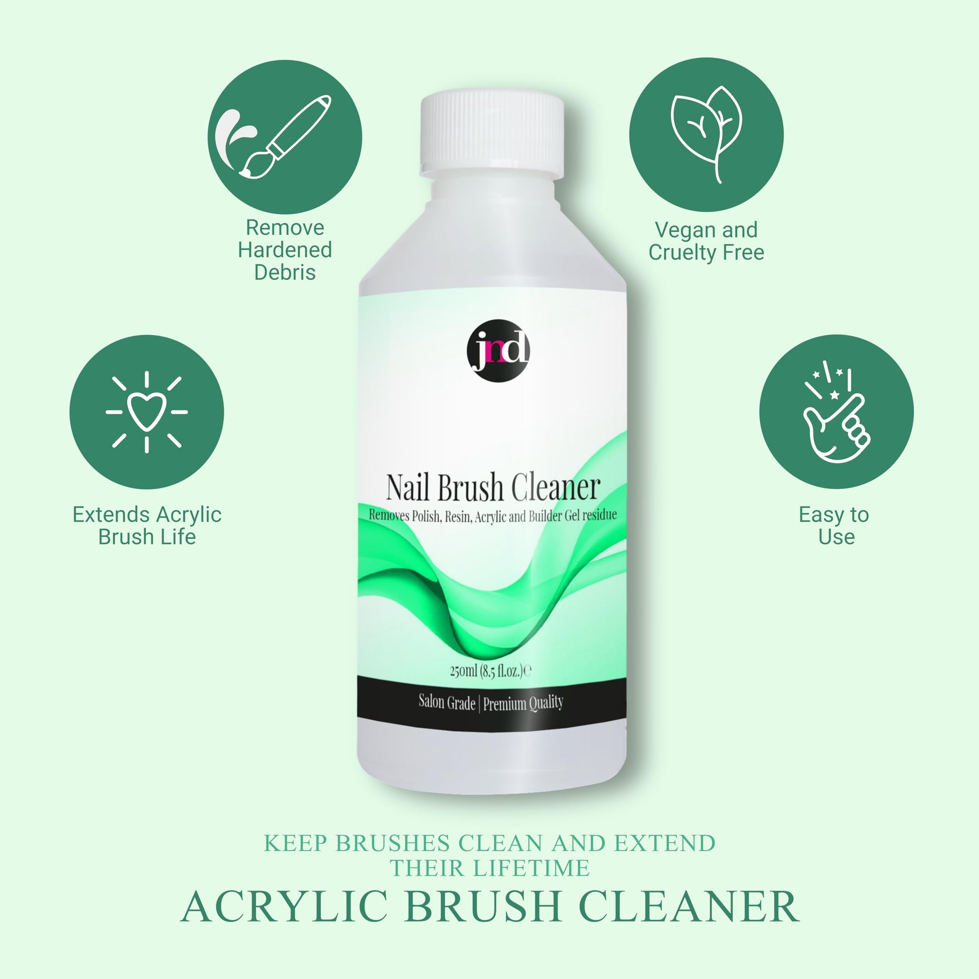 JND professional acrylic nail brush cleaner is the ideal solution to remove resins, polishes, acrylics and builder gel residue without damage, prolonging the life, performance and efficiency of your brushes.