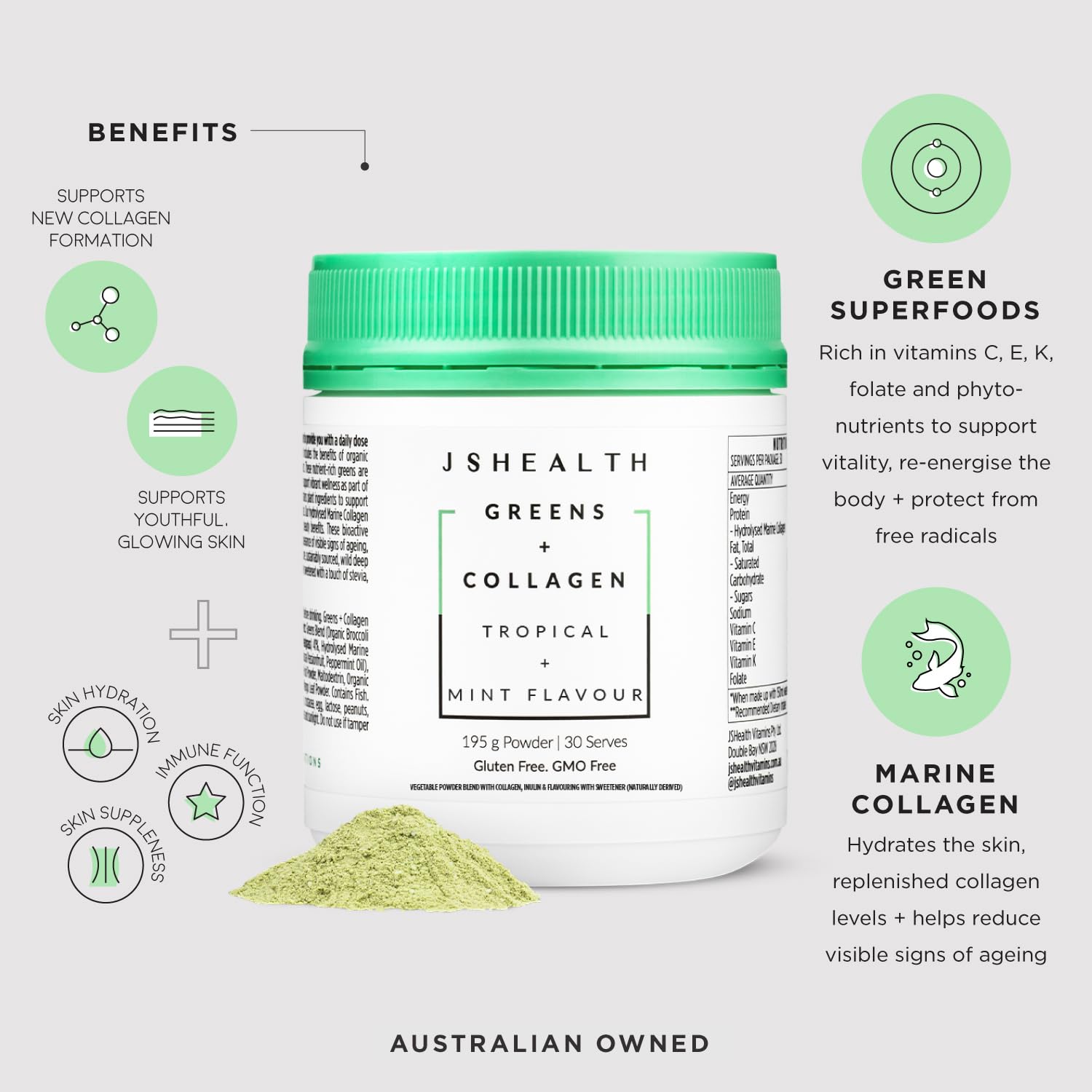The JSHealth Greens + Collagen formula contains selected greens ingredients along with hydrolyzed Marine Collagen peptides.
