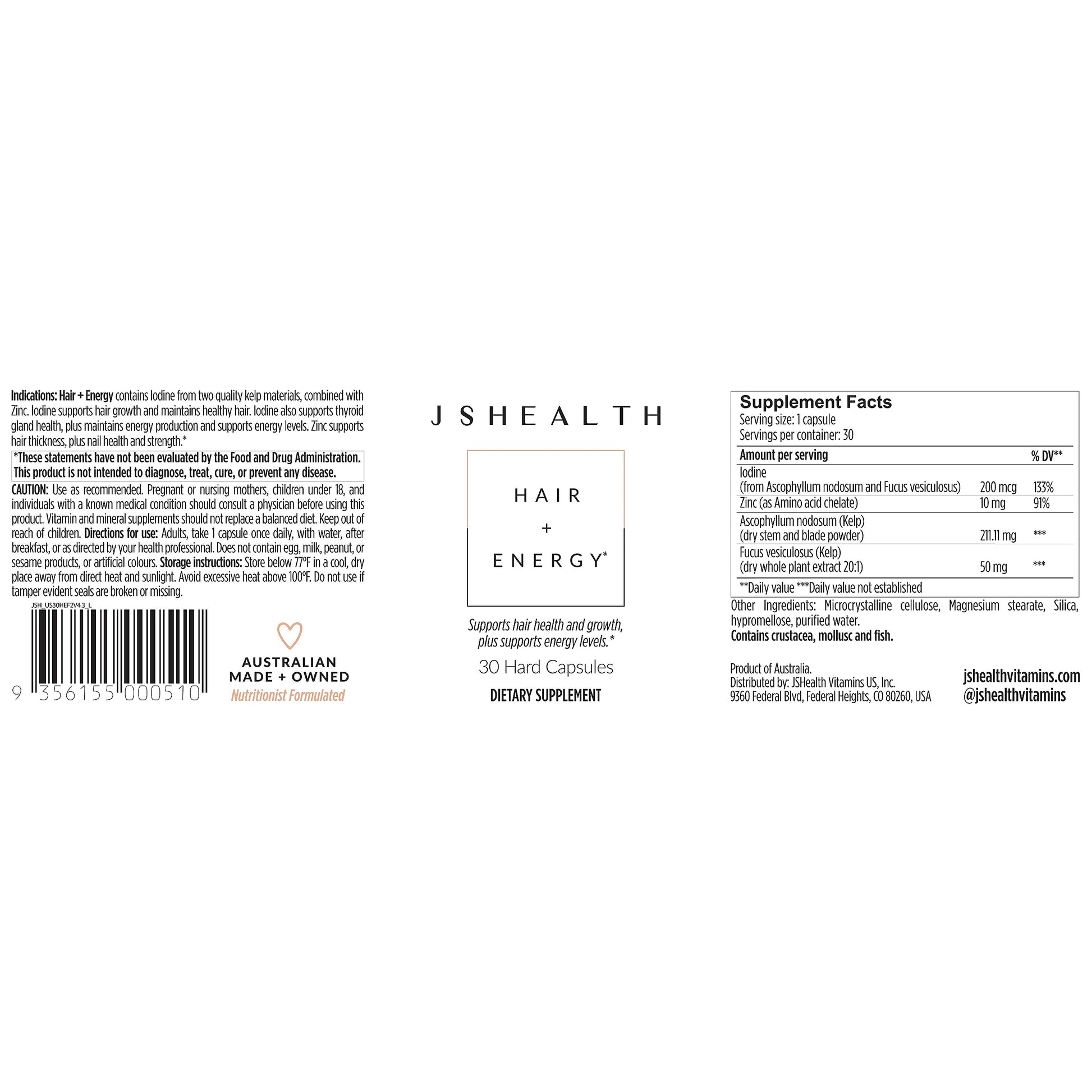 JSHealth Vitamins Hair and Energy Formula Hair Growth Vitamins | Hair Vitamins for Women and Men | Zinc and Iodine Hair Supplements for Hair Growth | Hair Loss Supplements | (30 Capsules)