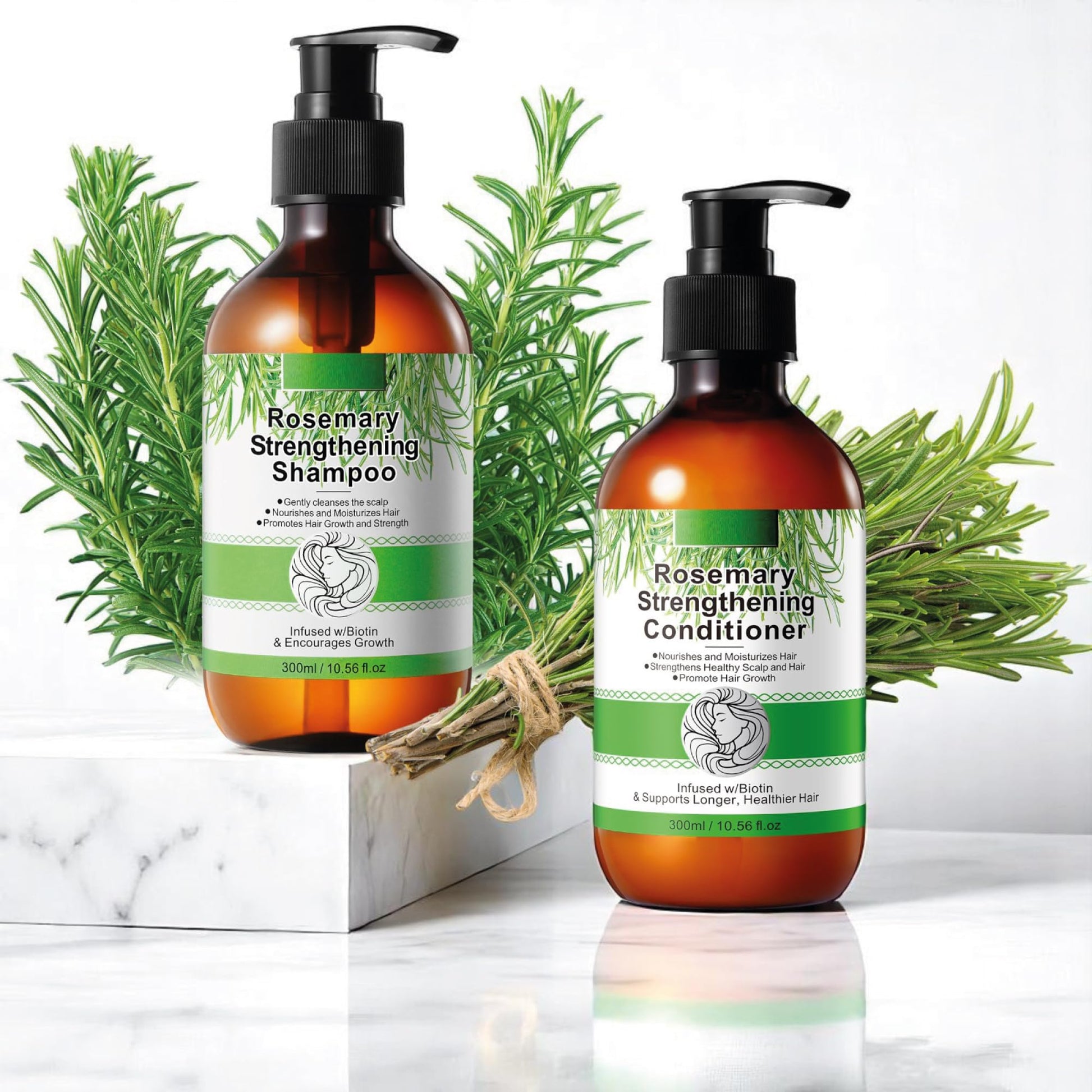 Discover the power of nature with our Rosemary Mint Shampoo & Conditioner Set – expertly formulated to support healthy hair growth, soothe the scalp, and restore strength to every strand. Whether you’re dealing with thinning hair, dryness, or an itchy scalp, this biotin-infused duo is your go-to solution for thicker, shinier, and more resilient hair. Key Benefits: 🌿 Rosemary Oil: Stimulates circulation to the scalp, reduces dandruff, and supports natural hair growth. ❄️ Peppermint Oil: Soothes irritation and helps maintain a clean, healthy scalp. 🌱 Ginger Oil: Strengthens hair follicles and roots, promoting long-term hair resilience and regrowth. 💧 Olive Extract: Deeply hydrates and boosts natural shine, keeping your hair looking radiant all day. 🥥 Coconut Oil: Repairs damage and encourages the regeneration of strong, healthy hair. 💊 Biotin: A vital nutrient that enhances hair strength, volume, and appearance. Ingredients Key Active Ingredient: Rosemary Oil Also includes: Peppermint, Ginger, Olive, Coconut Oil, Biotin, and other nutrient-rich botanical extracts. How to Use Apply a generous amount of shampoo to wet hair, gently massage into the scalp to create a rich lather, and rinse thoroughly. Follow with conditioner, focusing on mid-lengths to ends. For optimal results, use consistently with our rosemary oil treatment. Safety Information For external use only. Avoid direct contact with eyes. If irritation occurs, discontinue use. Keep out of reach of children. If pregnant or under medical supervision, consult your healthcare provider before use.More Info