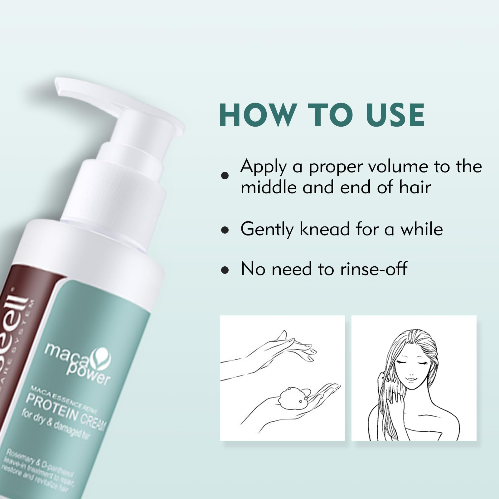 Apply a proper volume to the middle and end of hair, gently knead for a while, no need to rinse-off. This unique protein cream delivers essential nutrients to the hair's interior cortex,nourishes and moisturizes hair. It removes damaged cuticle and reconstructs damaged hair structure. This cream also enhances hair elasticity, restores split-ends and leaves hair lustrous and smooth.