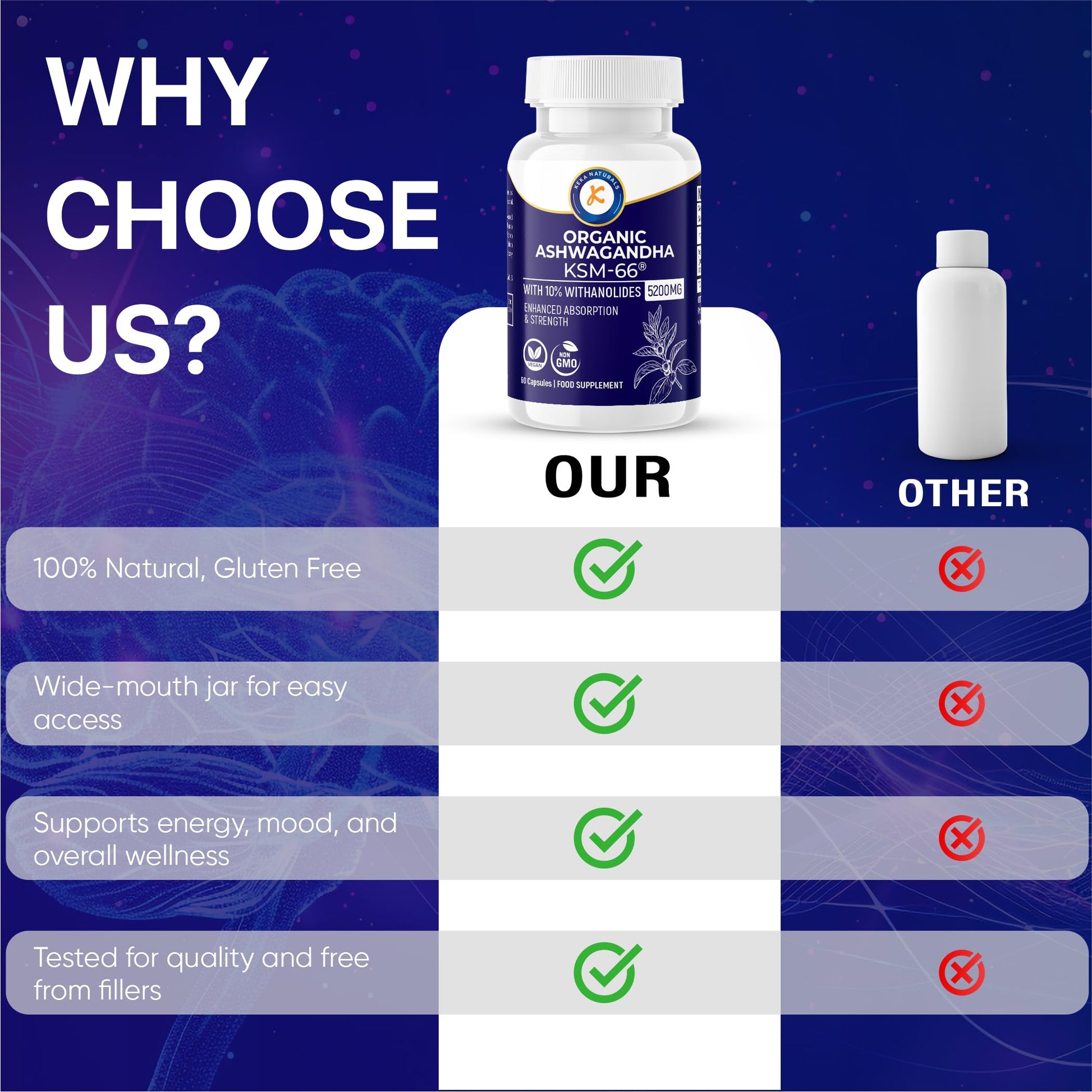 Keka Naturals Organic Ashwagandha KSM-66-5200mg - 10% Withanolides - Enhanced Absorption and High Strength - All Natural, Non-GMO - 60 Vegan Capsules