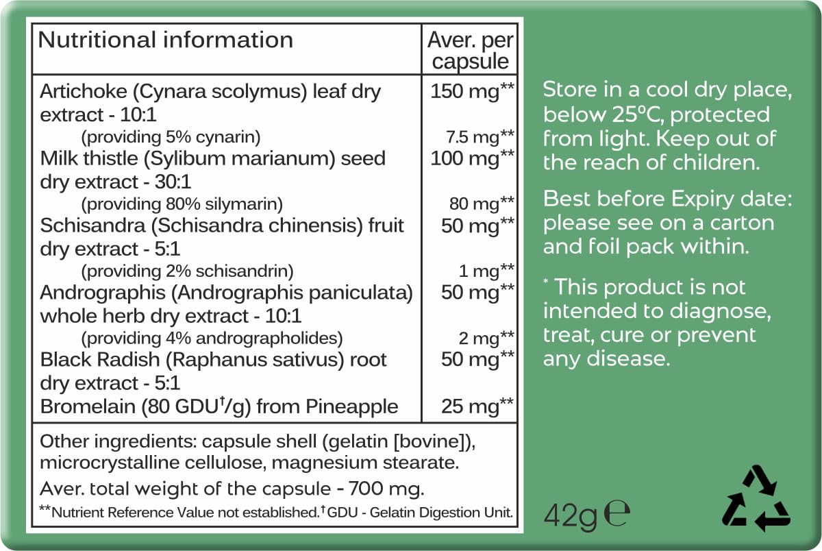 KEPTA LIVA Complex is an advanced herbal formula, consisting of extracts from well-researched plants - Artichoke, Milk thistle, Schisandra chinensis, Andrographis paniculata (Kalmegh). At Kepta we only use high-grade plant extracts with a maximum number of bioactive ingredients to make our herbal supplements. Each capsule of KEPTALIVA Complex provides 80 mg of silymarin from Milk thistle, 25 mg of bromelain from pineapple, 7.5 mg of cynarin from Artichoke, and 2 mg of andrographolides from Andrographis paniculata, and 1 mg of Schisandra from Schisandra chinensis. Ingredients: Artichoke leaf dry extract, Milk thistle seed dry extract, Schisandra chinensis fruit dry extract, Andrographis paniculata whole herb dry extract, Black Radish root dry extract, Bromelain from Pineapple, capsule shell (gelatin [bovine]), microcrystalline cellulose, magnesium stearate. Free from: Gluten, lactose, dairy, GMO. Suggested use: Take 1 capsule 2 times per day, preferably after a meal. Swallow with water. Not to be chewed. Do not exceed recommended daily dosage.More Info