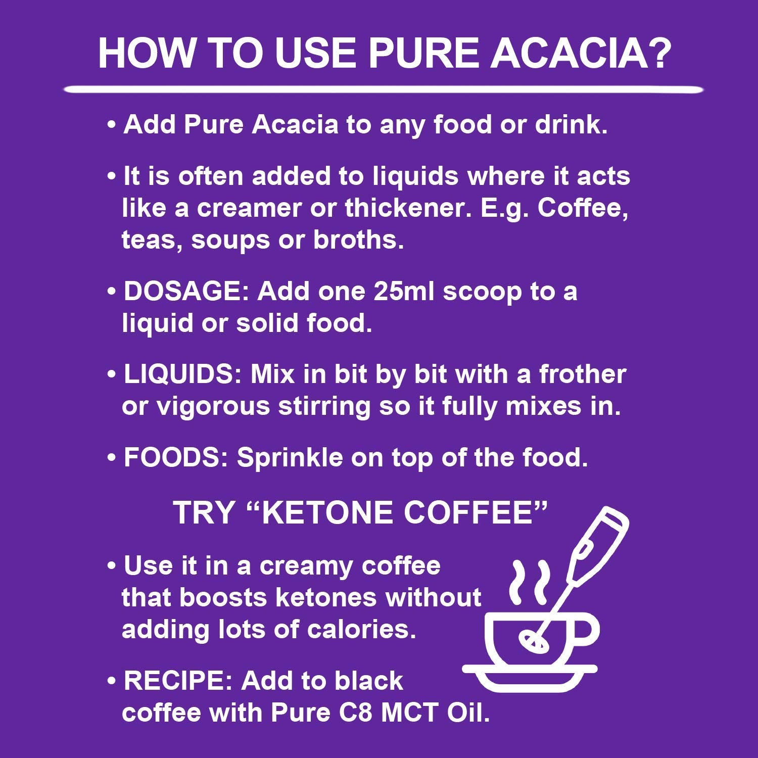 Directions: Take one dose of 25ml without food. Recommended Maximum Daily Dose: 75ml. Storage: Store away from direct sunlight. Net Quantity: 500g ℮ Lot/ Best Before End: See imprints on pouch label. Warnings: To avoid stomach upset ensure to follow exact dosage instructions. Food supplements should not be used as a substitute for a varied diet, balanced and healthy diet. This product is not intended to prevent, cure or treat any disease. Do not exceed the recommended daily dose. Store out of reach of young children. Distributor: Ketosource Limited, 71-75 Shelton Street, London WC2H 9JQ, United Kingdom WHAT IS PURE ACACIA? - A fibre in powder form to add to your food, tea or coffee to keep you full - Adds fibre to your diet without increasing blood glucose or adding calories - Works well with a low carb diet, ketogenic diet and fasting protocols IS THIS KETOGENIC FOR EVERYONE? - It has a ketogenic profile and is Guaranteed Ketogenic - Will not kick you out of ketosis and will not drop your ketones - Works for everyone on a ketogenic diet - Is suitable for the most strict ketogenic dietMore Info