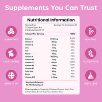 NURTURE YOUR LITTLE ONES - Our Kids Multivitamin is a complete blend of essential nutrients, carefully formulated to support optimal growth and development. Give your children the best foundation for a healthy future.GIVE THE GIFT OF OPTIMAL HEALTH - With our tasteless and easy-to-swallow capsules, you can ensure your child receives the essential vitamins and minerals they need for optimal health. We've kept our formula free from additives, providing the best possible nutrition without any unnecessary extras.
