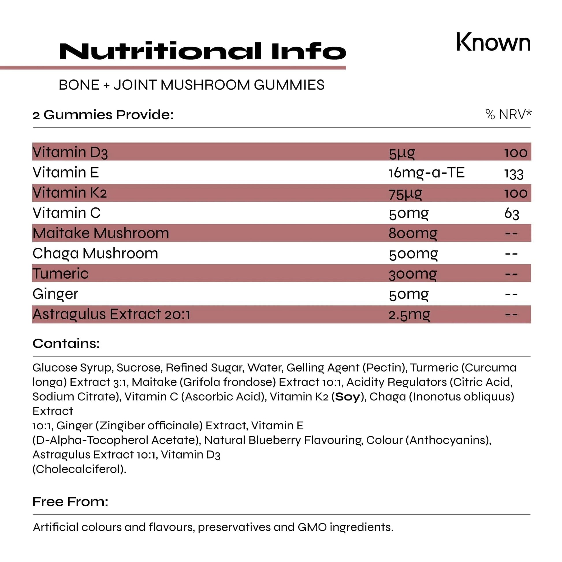 Known Bone & Joint Support Mushrooms Gummies with Maitake, Chaga, Vitamin D3 & K2 | Delicious Natural Blueberry Flavour | 60 Two-a-Day Vegan Gummies (One Month’s Supply)