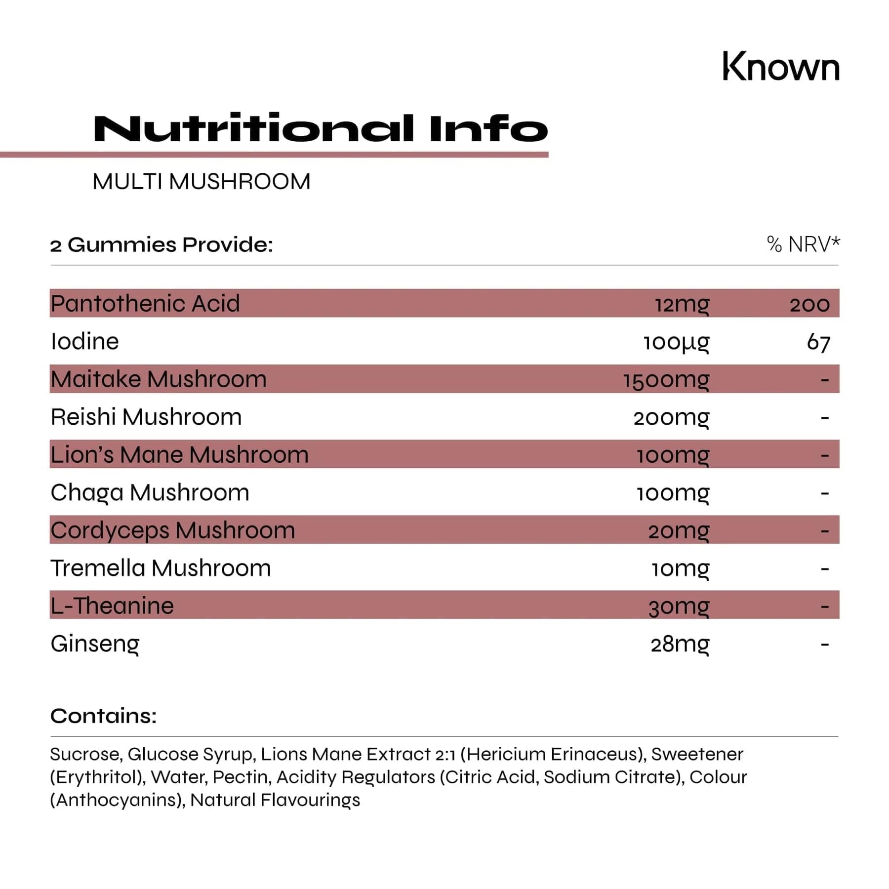 Known Multi Mushroom Complex Gummies - 2000mg Lions Mane, Reishi, Maitake, Chaga, Cordyceps, Tremella, Blackcurrant-Flavoured Gummies with L-Theanine, Ginseng, Pantothenic Acid, Iodine - Vegan (3)