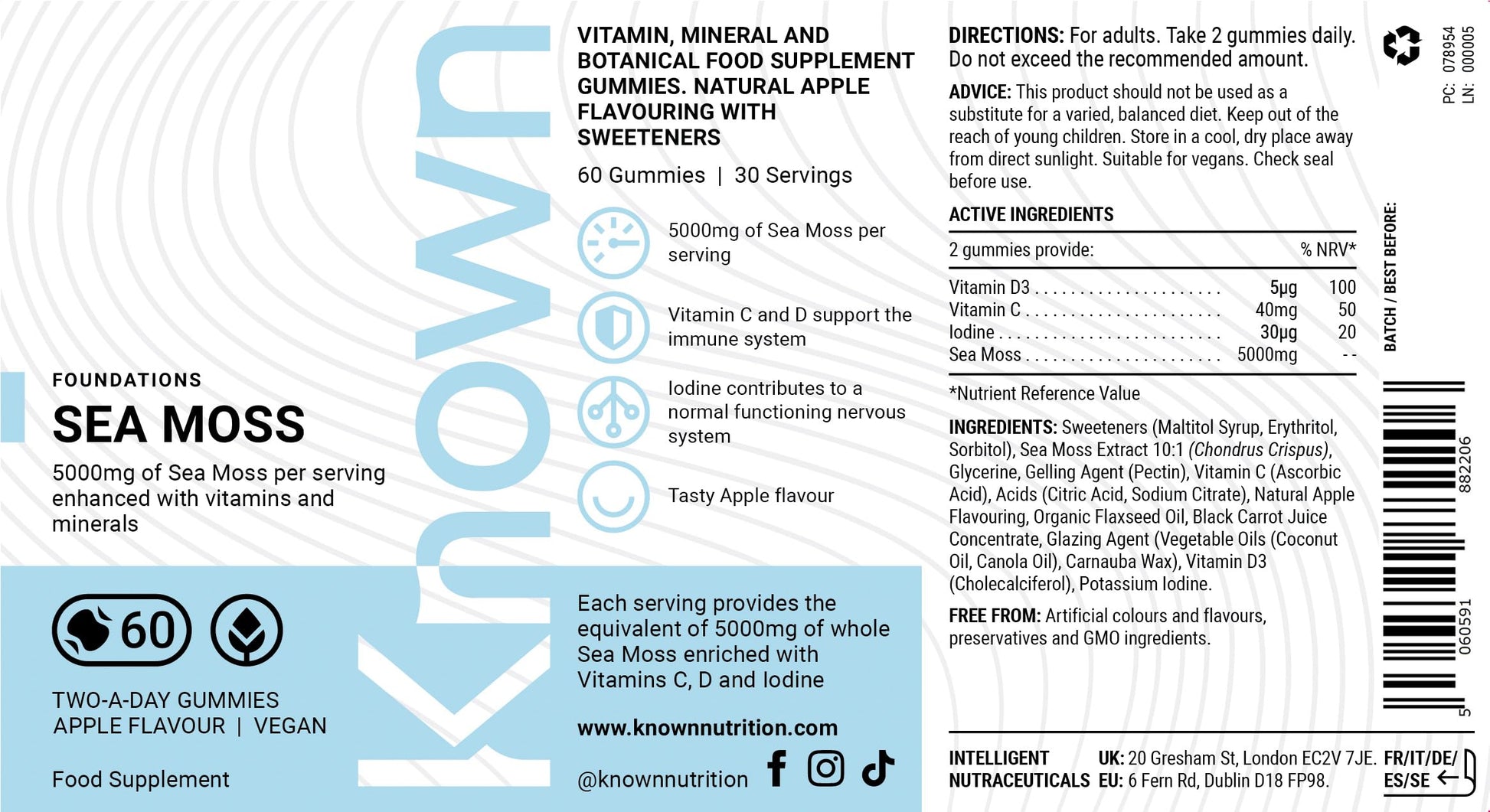 Known Nutrition’s Sea Moss Gummies provide a potent dose of 5000mg of Sea Moss per serving, combined with essential vitamins and minerals to support immune health and thyroid function. Sea Moss is a nutrient-dense seaweed that has long been appreciated for its natural wellness benefits. These gummies also feature Vitamin C to support immune function and Iodine for thyroid health, essential for energy and metabolism (EFSA).Flavoured naturally with Apple and crafted without artificial colours or flavours, these gummies are suitable for vegan and Halal diets. Manufactured to the highest standards, Known Nutrition’s Sea Moss Gummies are manufactured to the highest standards, BRC accredited, ensuring quality and reliability. With a 1-month supply at 2 gummies per day, they offer a convenient, tasty way to support your daily wellness goals.More Info