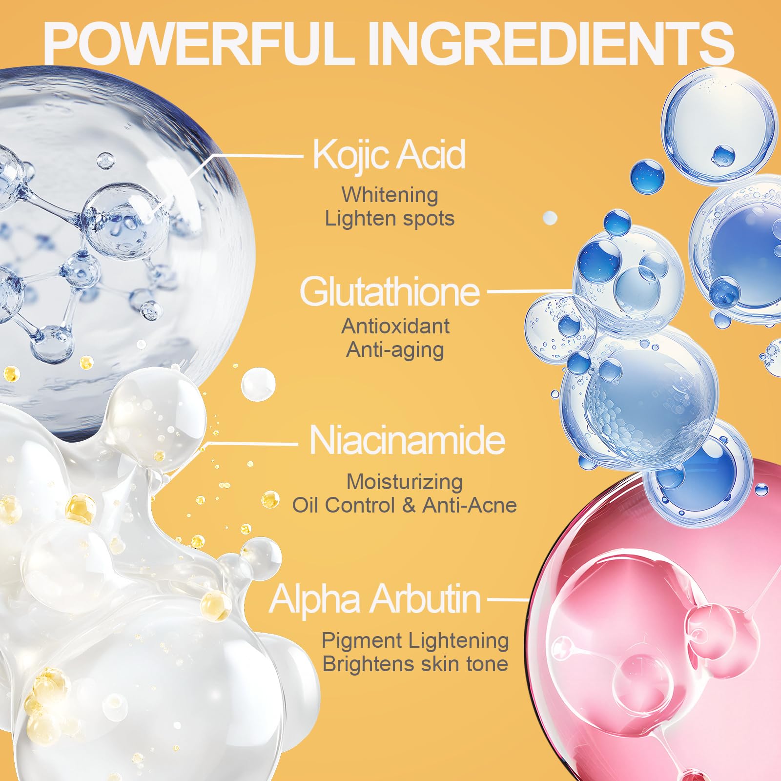 √ Powerful Ingredients: Kojic Acid, Alpha Arbutin, Niacinamide, and Glutathione work together to reduce melanin, fade spots, and even skin tone.