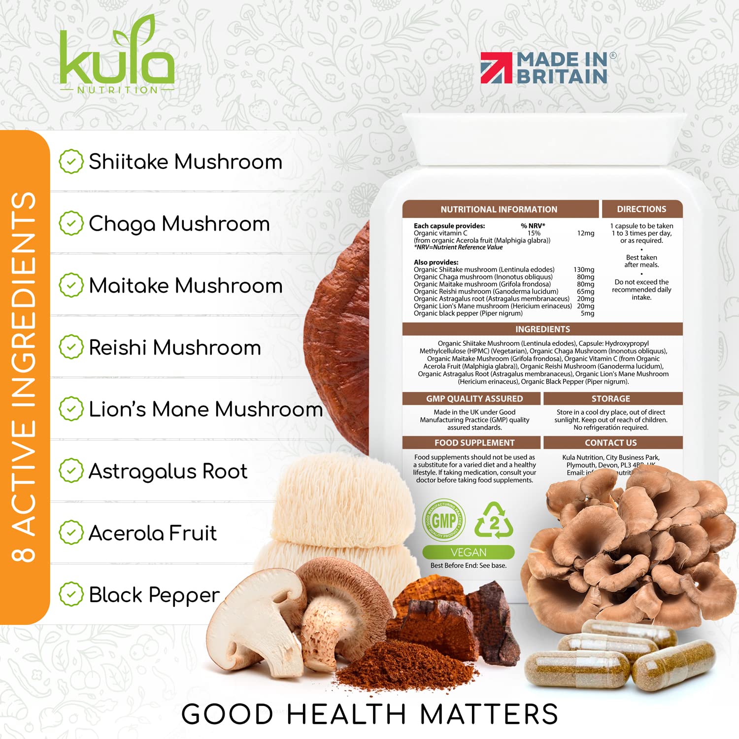 A blend of 100% organic dried powdered mushrooms, including Shiitake, Chaga, Maitake, Reishi, and Lion's Mane. To boost the potency and bioavailability of the formula, we've added organic black pepper. But that's not all - our mushroom complex also includes Organic Astragalus Root and Organic Acerola Fruit, which is a rich source of natural Vitamin C. Vitamin C is known to support the normal function of the immune system, making it an essential nutrient for the overall health. Moreover, our mushroom supplement contains the natural food form of Vitamin C found in acerola cherries, which may support brain function and contribute to the normal psychological function of the body.