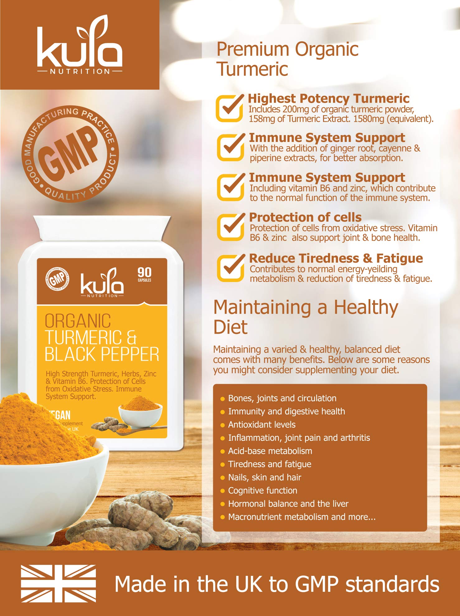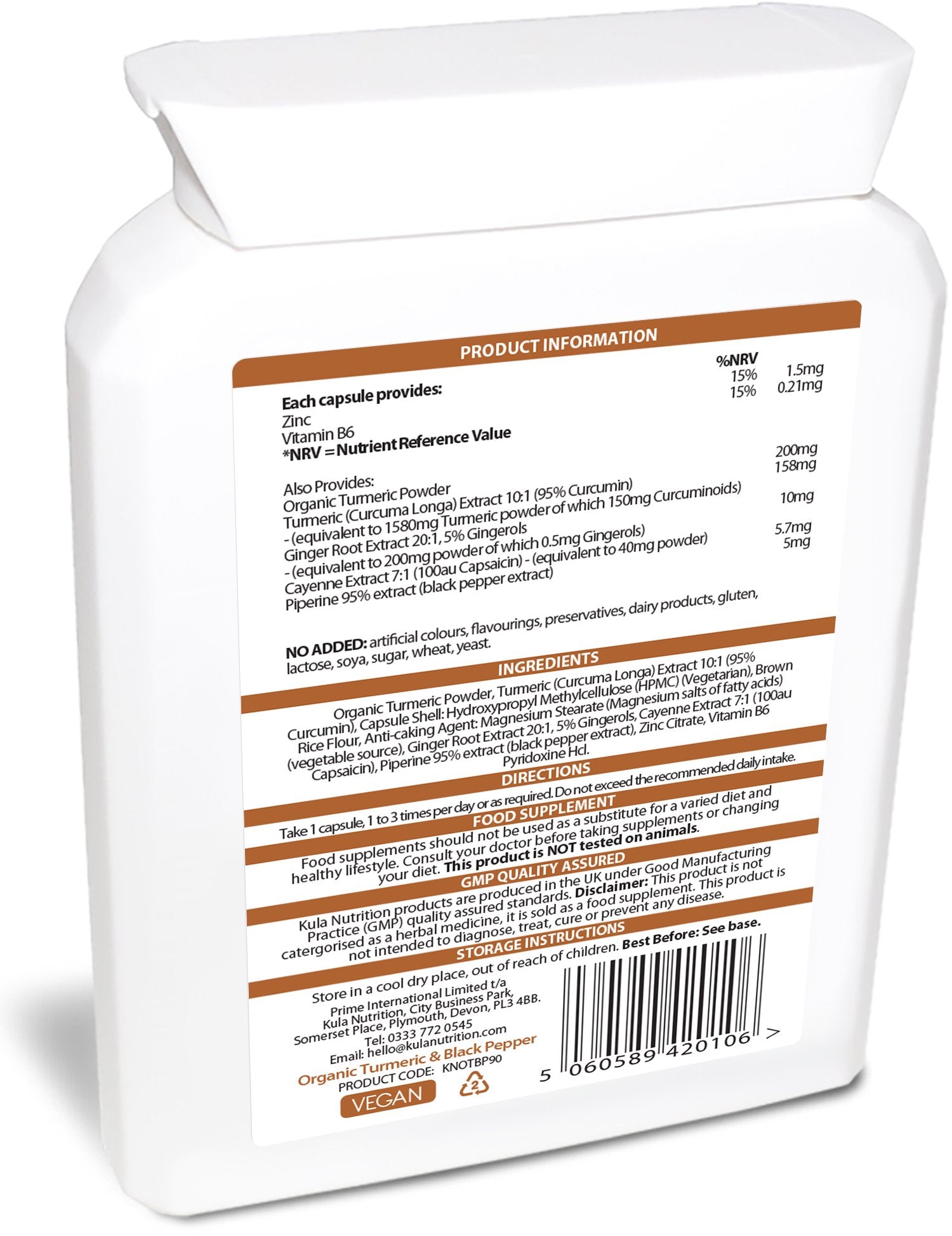 Enjoy the health benefits of Organic Turmeric with our best selling high potency Organic Turmeric & Black Pepper herbal food supplement formula. This high strength natural herbal turmeric food supplement contains only the finest high quality ingredients including 200mg of Organic Turmeric Powder, 158mg of Turmeric (Curcuma Longa) Extract 10:1 (95% Curcumin), which is equivalent to a whopping 1580mg of Turmeric powder of which 150mg Curcuminoids, plus Ginger Root Extract, Cayenne Extract, Piperine 95% Extract, Zinc and Vitamin B6.