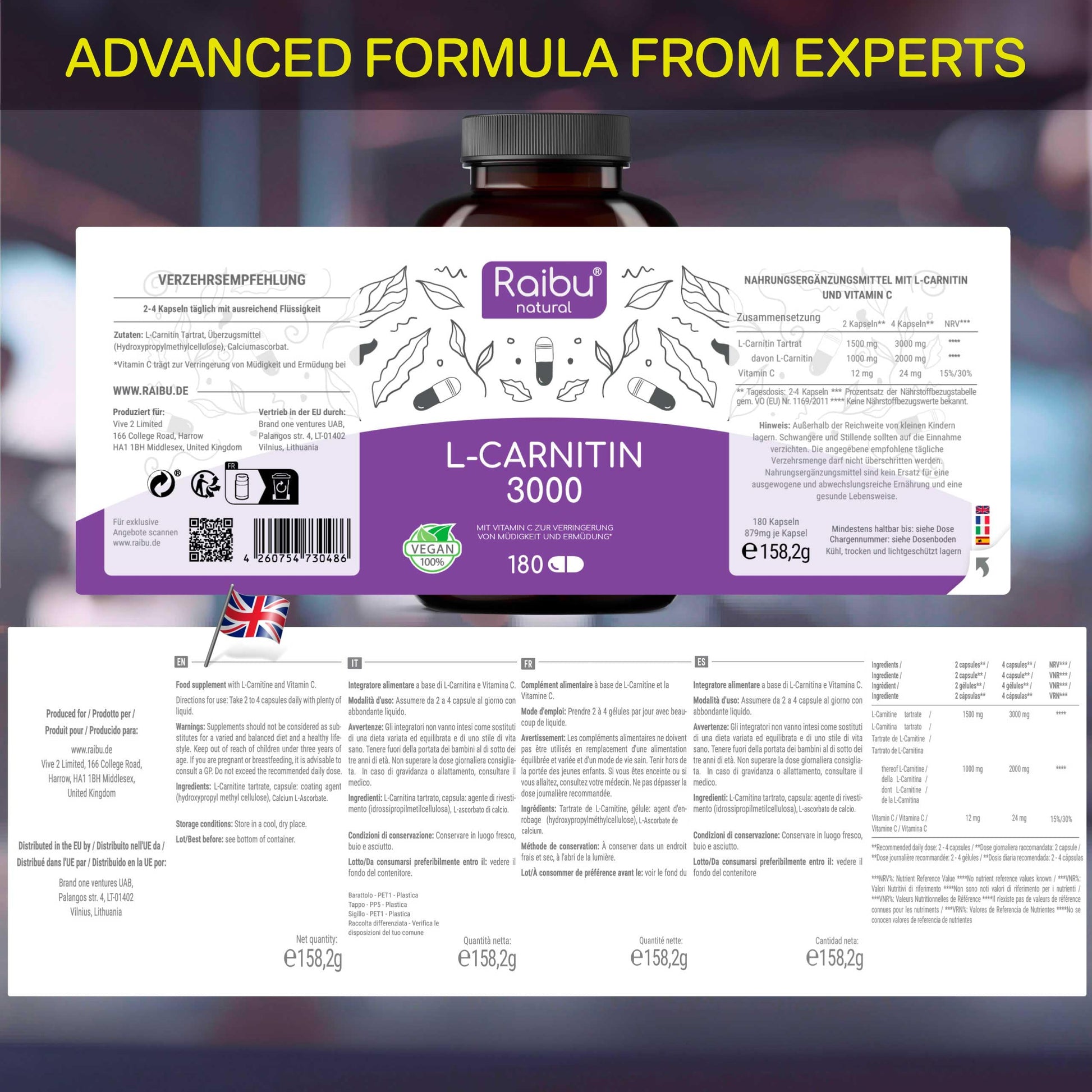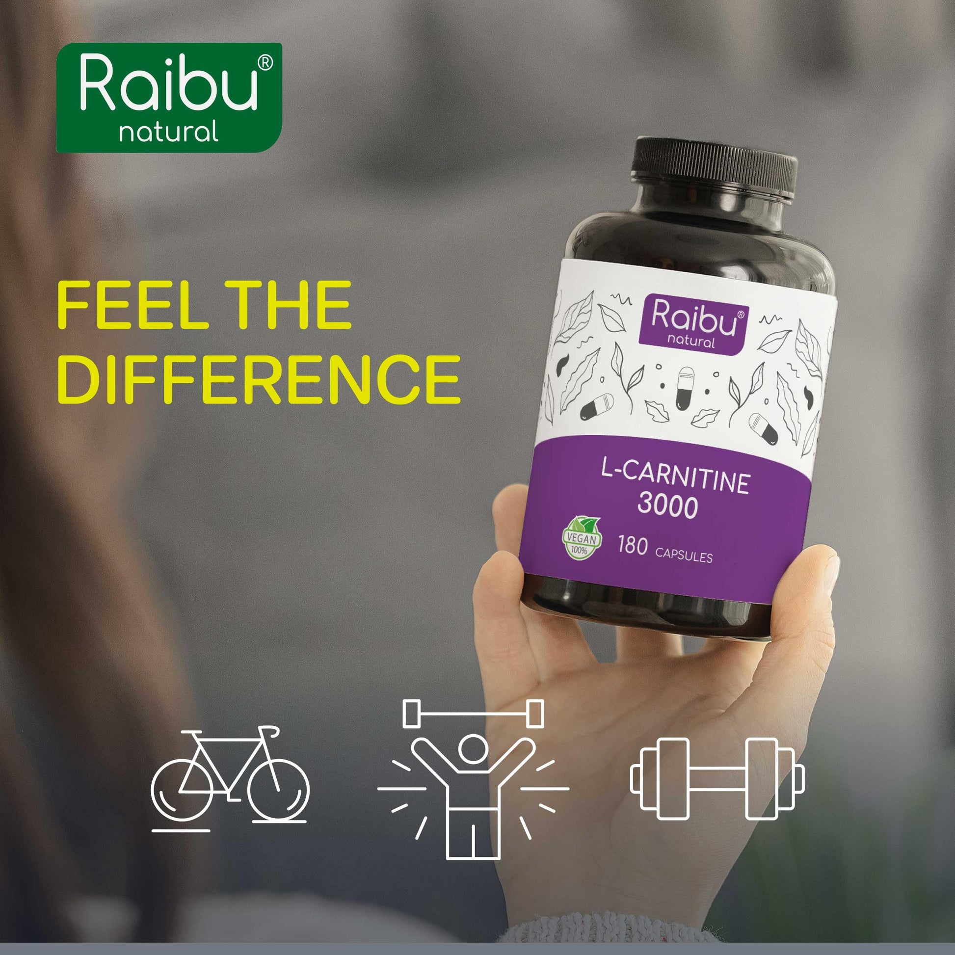 L-Carnitine 3000-180 High-Strength Capsules with Vitamin C - L-Carnitine Tartrate 3000mg per Daily Dose - Energy & Metabolism Support - Vegan, Natural & Laboratory Tested - Raibu