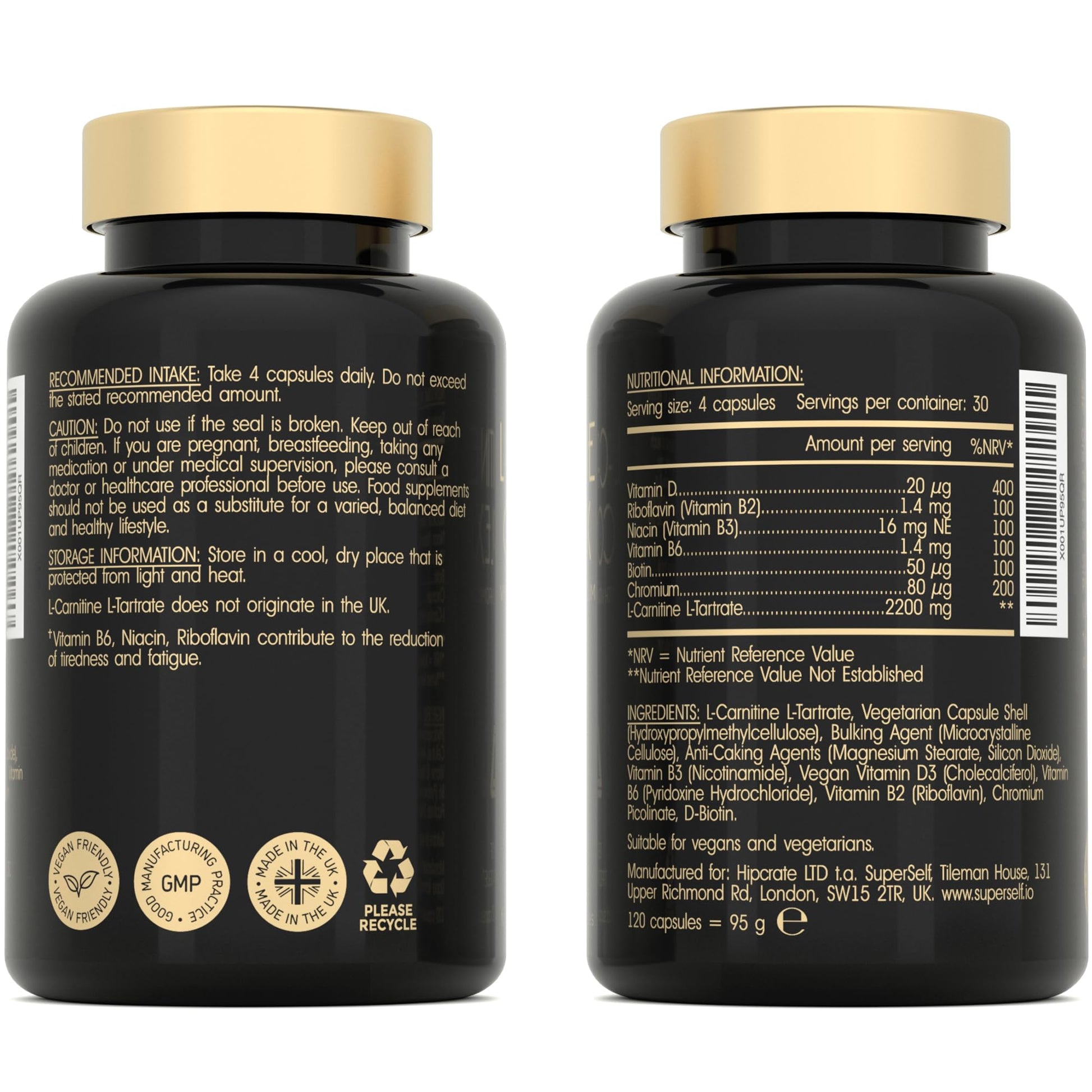 The SuperSelf L-carnitine supplement is a high-strength formula that comes in easy-to-swallow capsules. Each serving contains 2200mg of L-carnitine, with 2 capsules to be taken before a workout to enhance performance and 2 capsules after a workout to aid in muscle recovery. This one-month supply supplement is designed to fuel your energy levels and is enhanced with complimentary nutrients such as Vitamin D, B2, B3, B6, and Chromium to support your active lifestyle and fitness goals. The rapid absorption technology ensures that the vegan-friendly L-carnitine is quickly utilized by the body, helping to turn fat into energy. Manufactured in the UK to high quality standards, the capsules are free from GMOs, antibiotics, dairy, and hormones. SuperSelf is committed to creating supplements that help you live well, and part of the profits from this purchase goes to Vitamin Angels to reduce preventable diseases in children worldwide.More Info