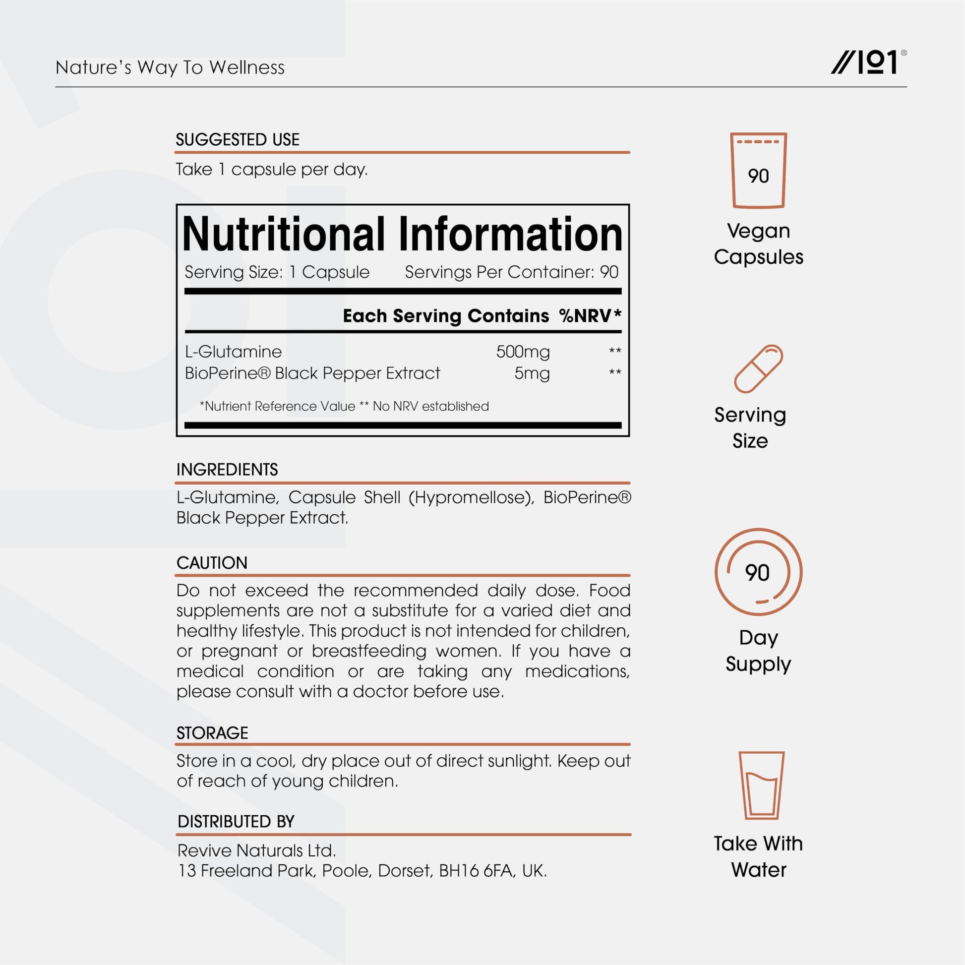 L-Glutamine 500mg with BioPerine® - 90 Veg Capsules (3 Months Supply) - Fermented Amino Acid Supplement - by Alpha01